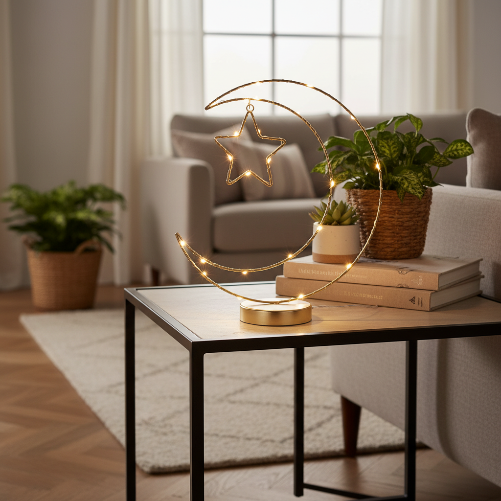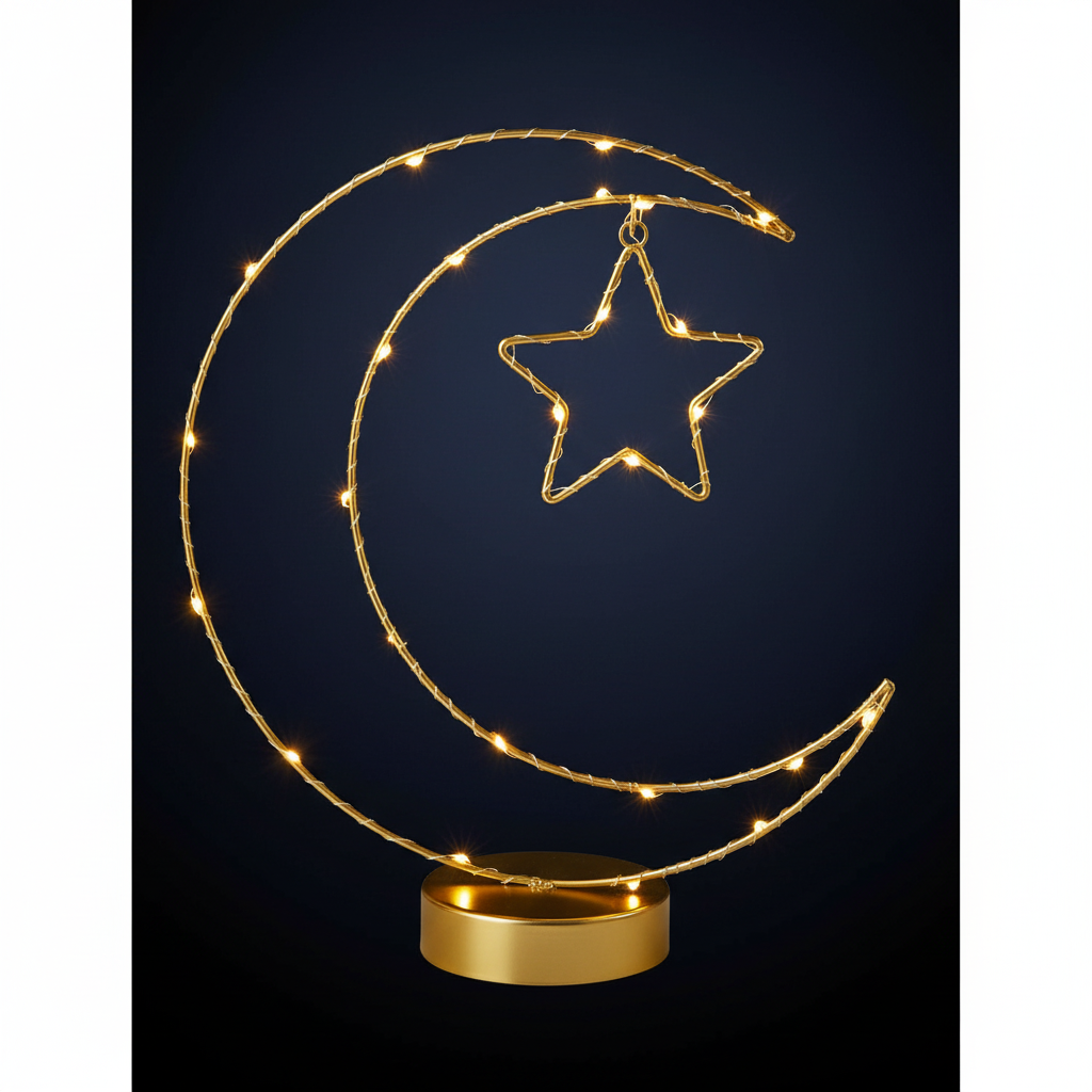 Create a calm and elegant Ramadan atmosphere with this gold moon and star LED table decoration. Designed with a Moroccan-inspired metal structure and warm white micro LEDs, this decorative table light brings a soft, comforting glow to your indoor spaces. The crescent moon and star silhouette adds a traditional yet refined touch, making it ideal for Ramadan evenings and festive home décor.