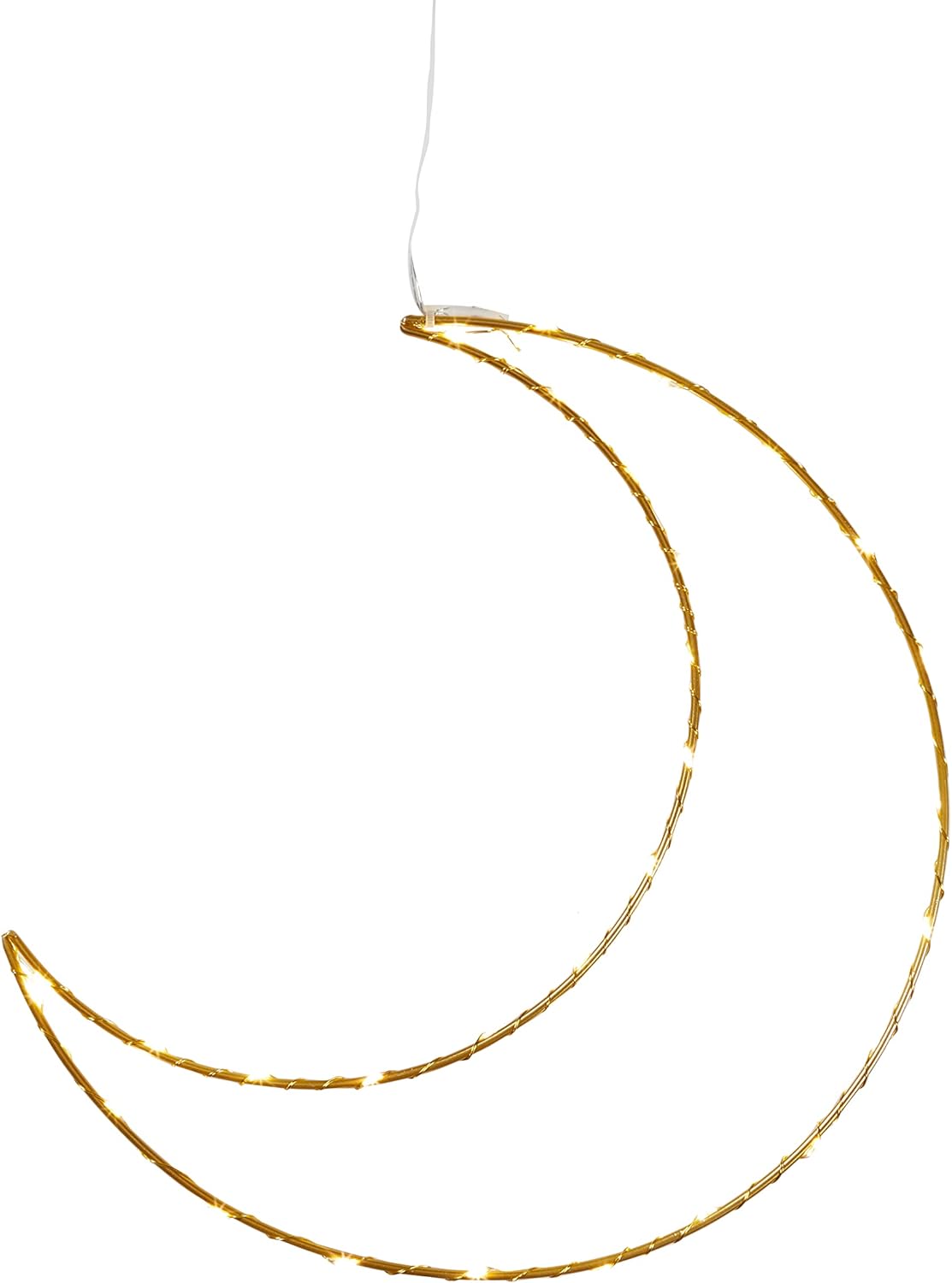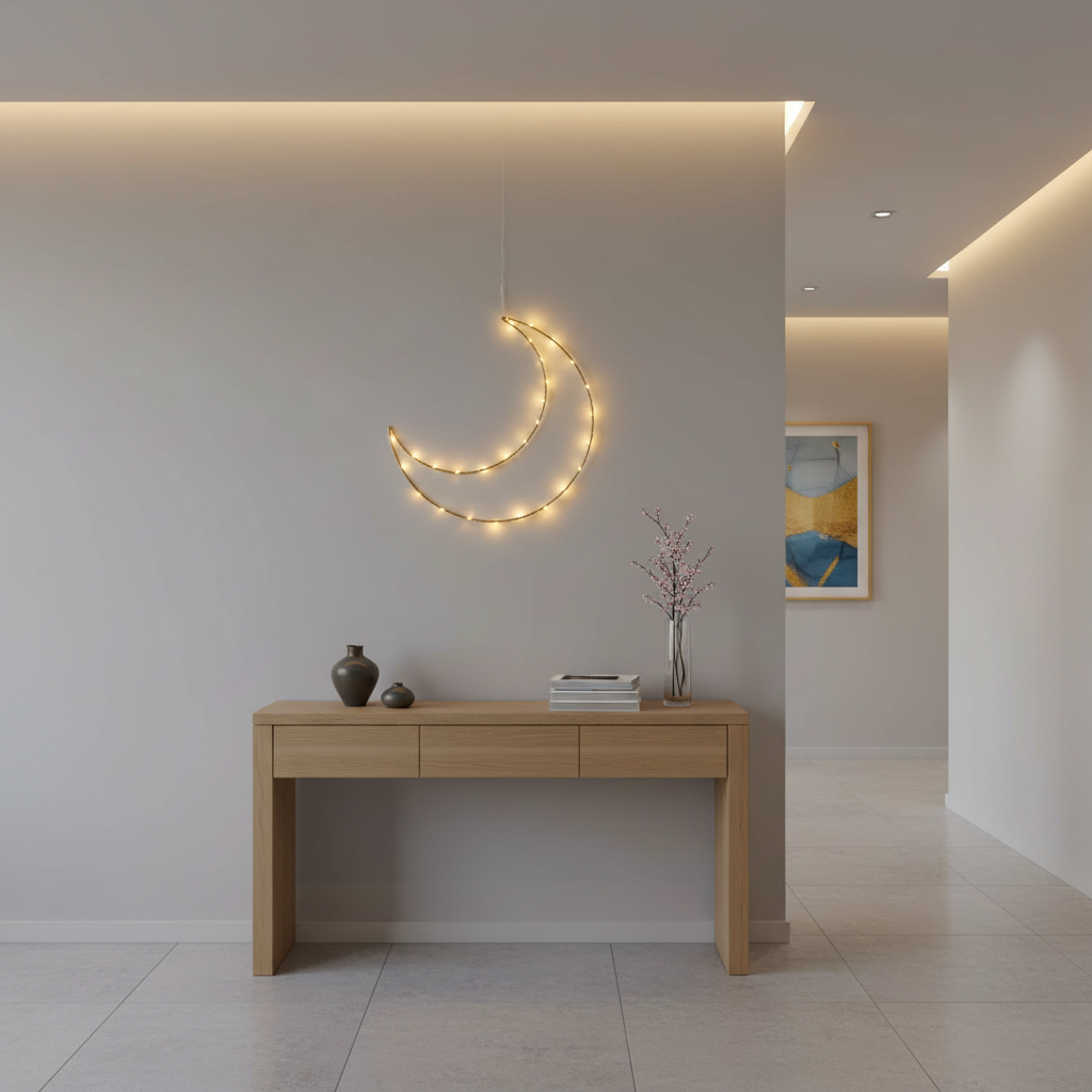 Add a soft and elegant glow to your home with this gold Ramadan light up moon hanging decoration. Designed with warm white LEDs, this decorative moon creates a peaceful and welcoming atmosphere that beautifully complements Ramadan evenings. Its classic crescent shape with subtle star detailing makes it an ideal accent for bedrooms, living rooms, and nurseries during the holy month.