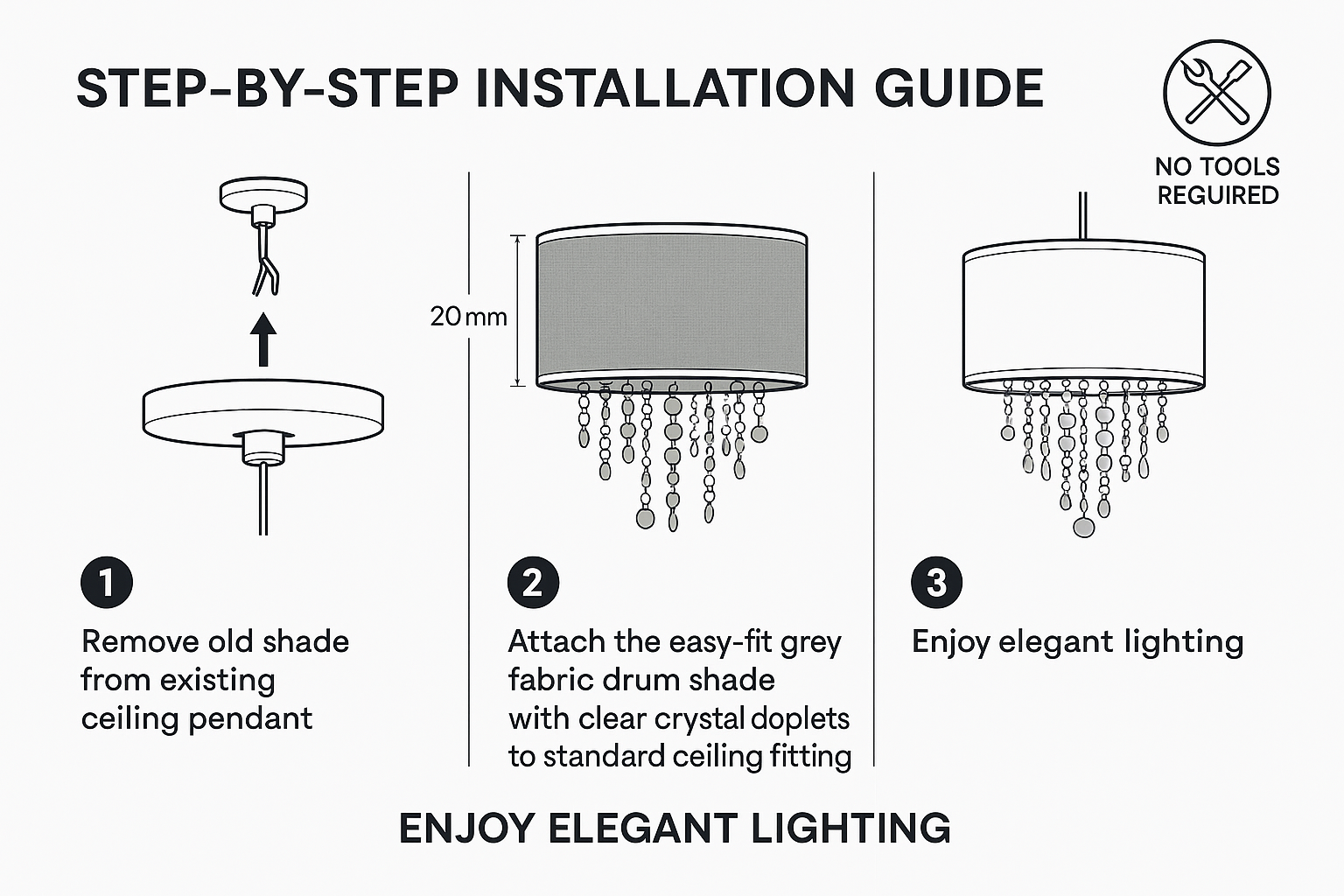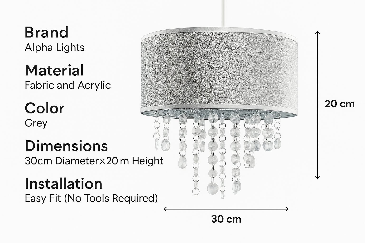 Transform your interior lighting with the Grey Fabric Acrylic Jewel Droplet Drum Pendant Shade. Featuring a soft grey fabric drum complemented by hanging acrylic jewel droplets, this easy-fit shade delivers elegance and sparkle to your ceiling lights. Ideal for living rooms, hallways, and bedrooms, it combines timeless style with effortless installation.