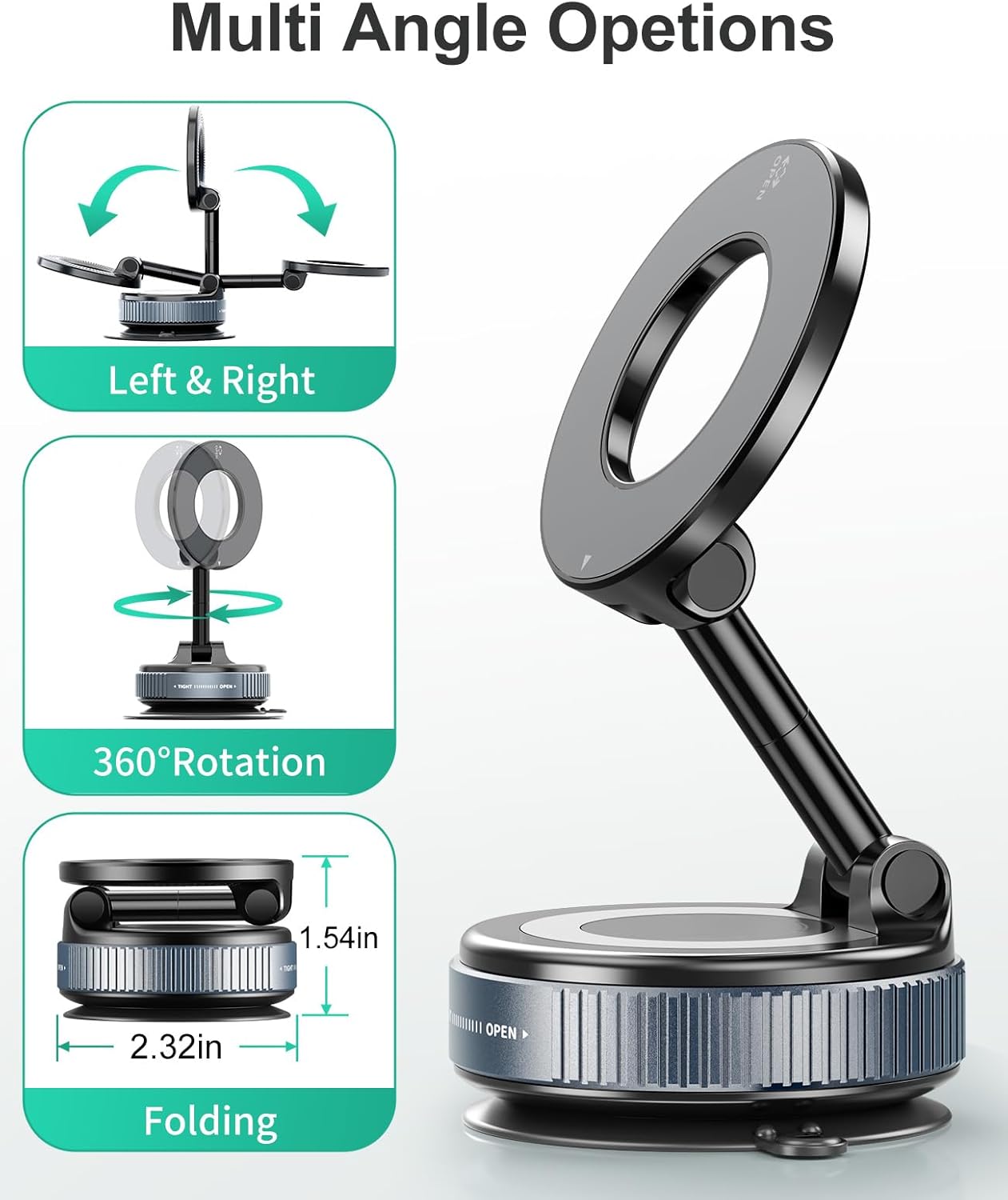 Experience the HanCenDa Vacuum Suction Magnetic Phone Holder for MagSafe, the ultimate magnetic car mount designed for maximum grip and stability. Featuring a powerful vacuum suction base with a manual twist-lock mechanism, this phone holder ensures your device stays securely attached even on rough or bumpy roads. Built with 24 ultra-strong N55 magnets, it offers a tight magnetic connection that keeps your phone safe without affecting signal, GPS, or charging performance.