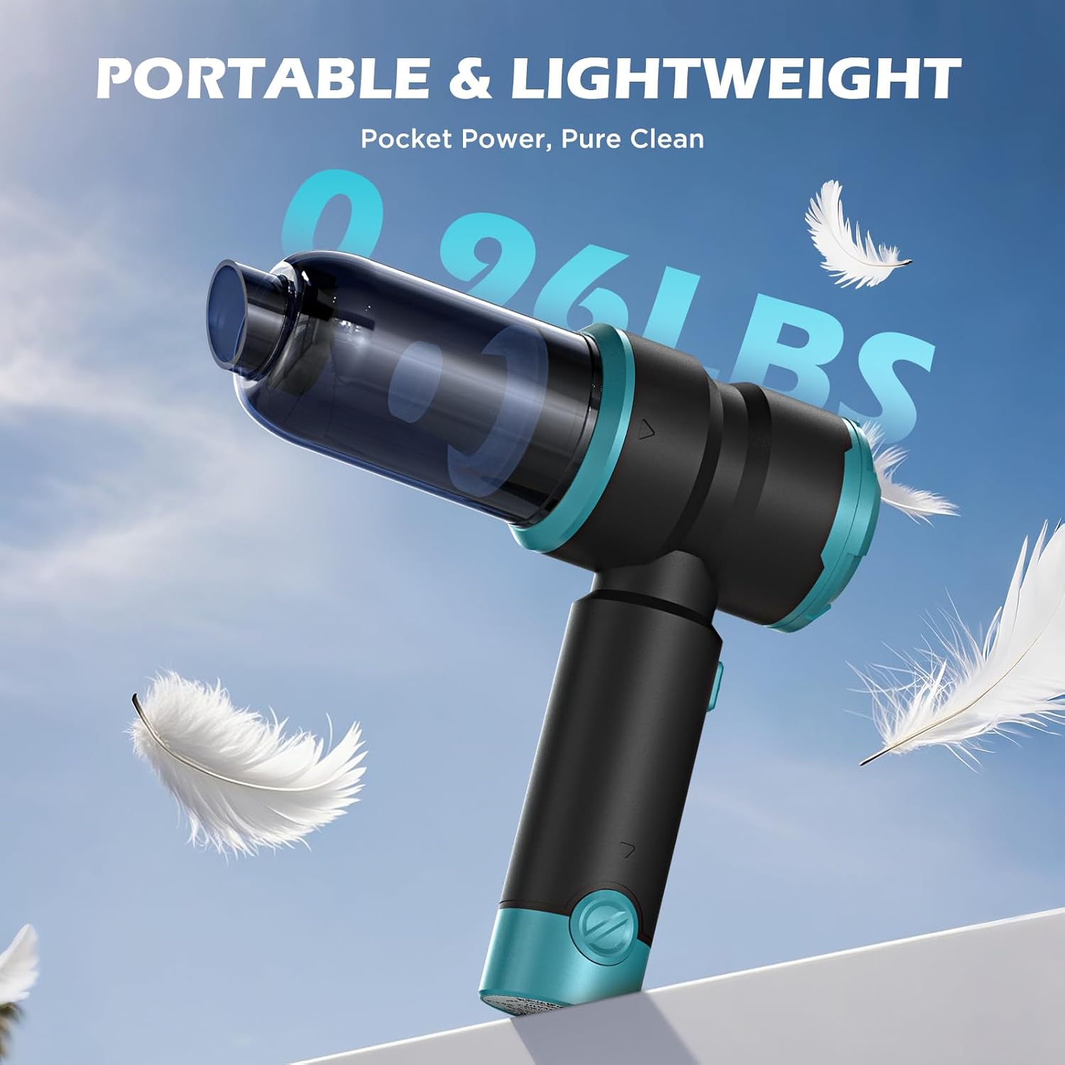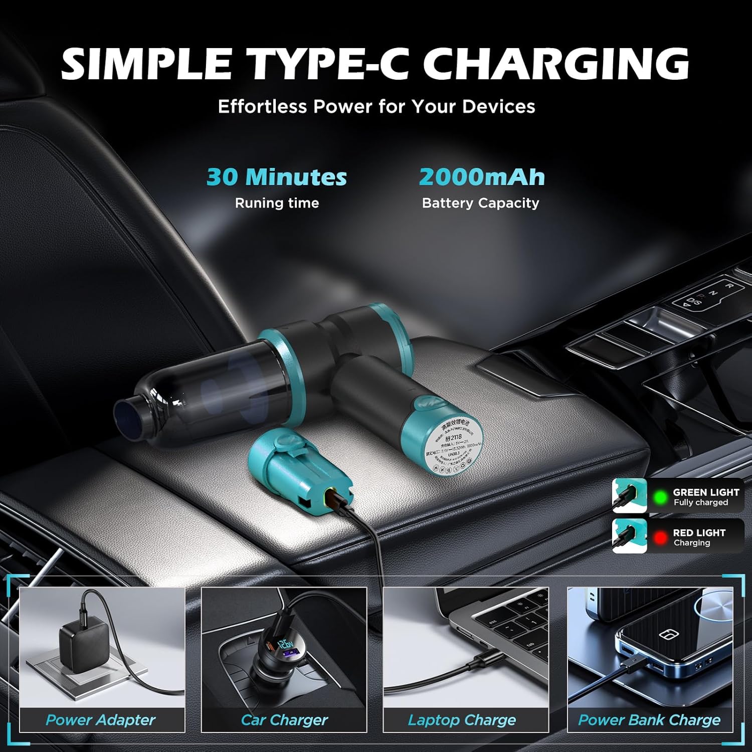Our Handheld Cordless Car Vacuum Cleaner delivers an impressive 15000Pa of suction power through its advanced brushless motor, making it ideal for removing dust, crumbs, and pet hair from car interiors, sofas, and tight corners. Featuring a 4-in-1 multifunctional design, it offers suction, blowing, quick inflation, and pumping capabilities for complete cleaning versatility. With a rechargeable 2000mAh battery, two washable HEPA filters, and a lightweight 0.96lb design, this portable vacuum provides powerful, convenient, and eco-friendly cleaning for your car, home, or office.