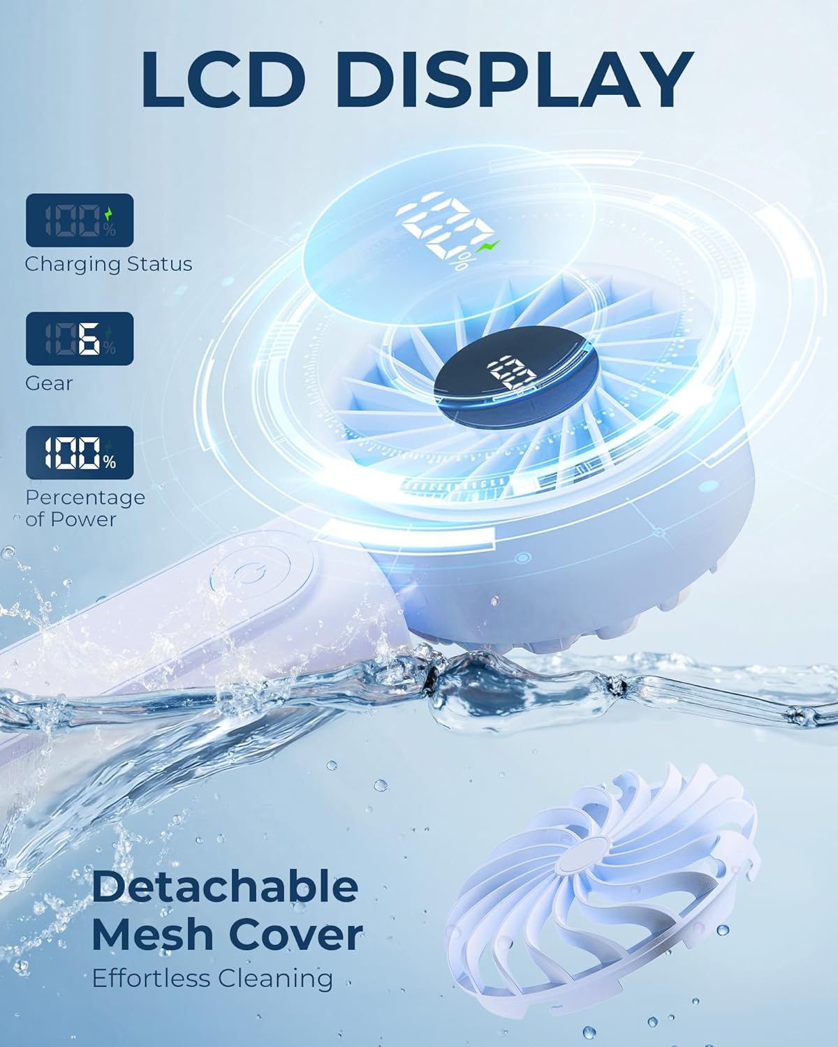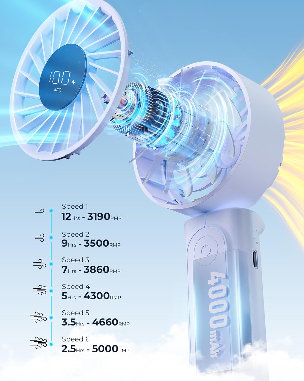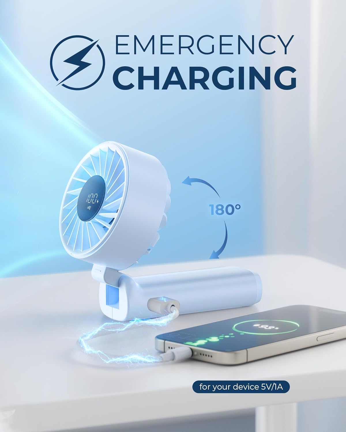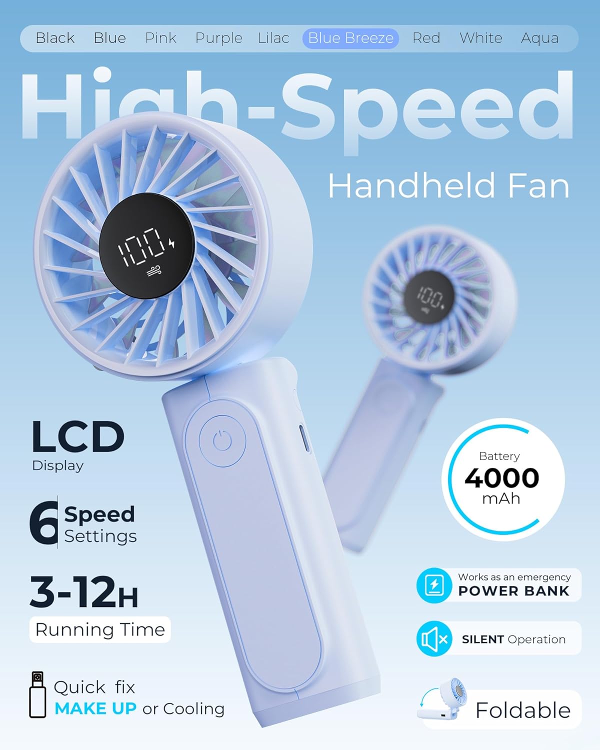 Our portable handheld fan with 4000mAh rechargeable battery, LED display, 6 speeds, brushless motor, 180° foldable design and power bank function delivers fast and quiet cooling for home, office, travel and outdoor use. The compact pocket-size build and lightweight structure make it easy to carry, while the one-button control ensures simple operation for all users. The LCD digital display clearly shows wind speed and battery level, and the multi-functional design allows use as a handheld fan, desk fan or neck fan for flexible everyday comfort.