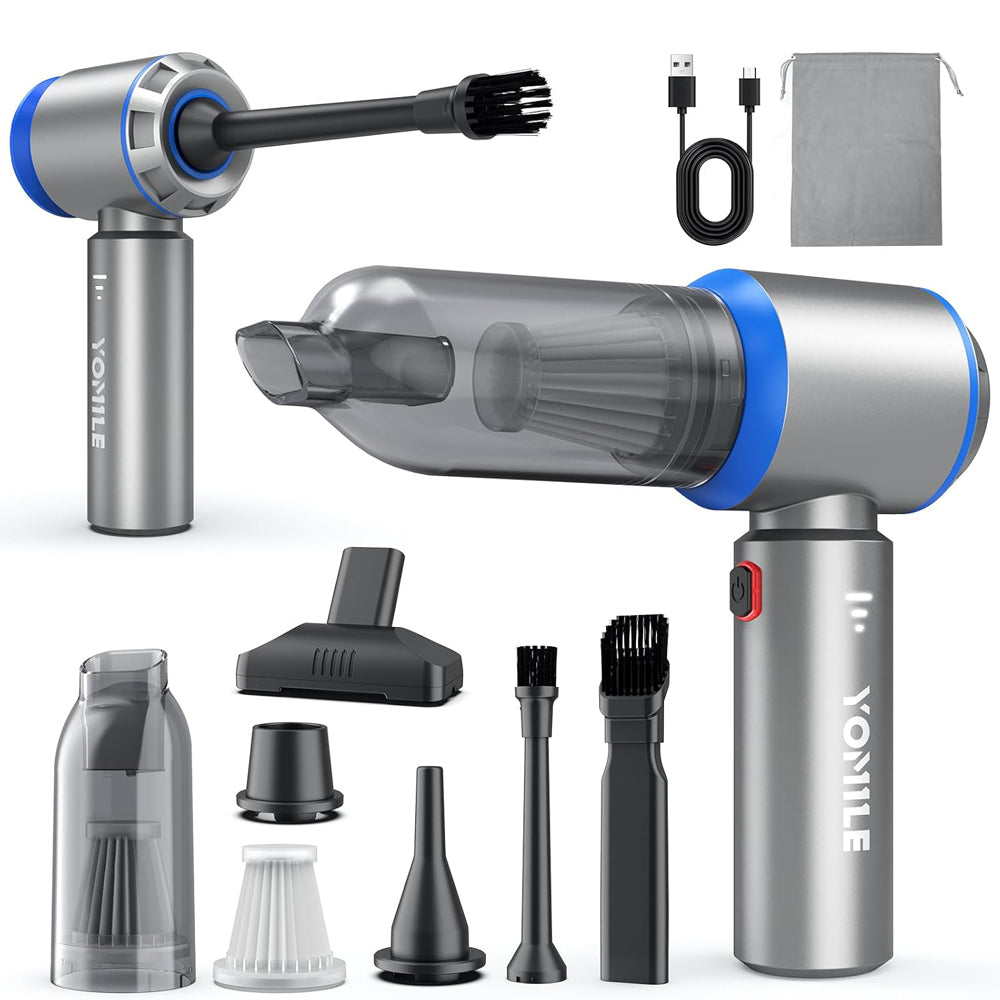 The Handheld Vacuum Cleaner by Yomile is a powerful and versatile cleaning solution designed for cars, offices, and homes. Featuring 25,000Pa suction power with a 120W high-speed motor, it easily removes dust, crumbs, pet hair, and sand from hard-to-reach corners, car seats, and sofas. This cordless, lightweight vacuum includes a 9000mAh rechargeable battery, offering up to 40 minutes of continuous cleaning. Its 4-in-1 functionality allows you to vacuum, blow, inflate, and deflate, making it ideal for air mattresses, keyboards, vents, and compressed cleaning tasks. Compact and portable, it fits conveniently in a backpack or toolbox, making it the ultimate mini car vacuum cleaner for deep cleaning anywhere.