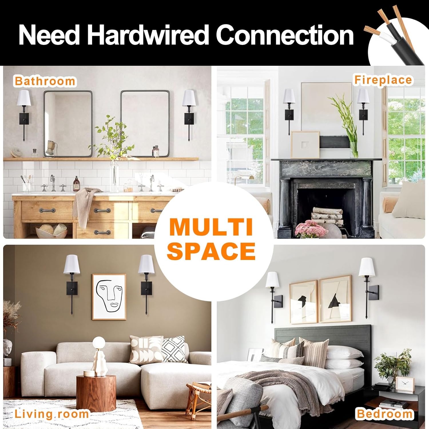 Our hardwired black wall sconces set of 2 is designed to deliver elegant, reliable accent lighting for bathrooms, bedrooms, living rooms, dining areas, and hallways. Featuring a classic black metal frame with soft white fabric shades, these wall lights provide warm, diffused illumination while complementing farmhouse, transitional, and modern interiors. Built for permanent installation, the sconces support E27 LED bulbs and offer durable construction for long-lasting performance in everyday home environments.
