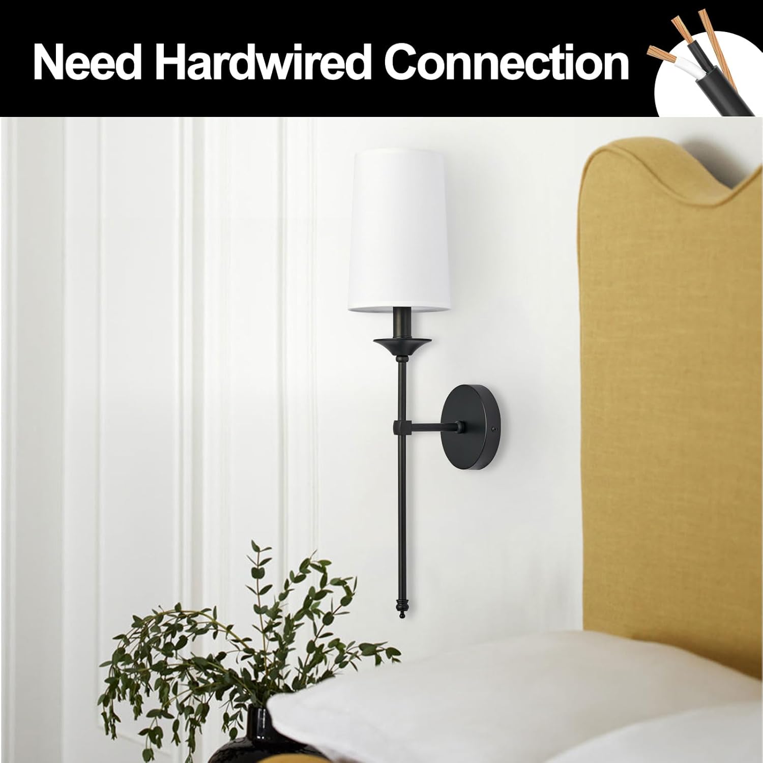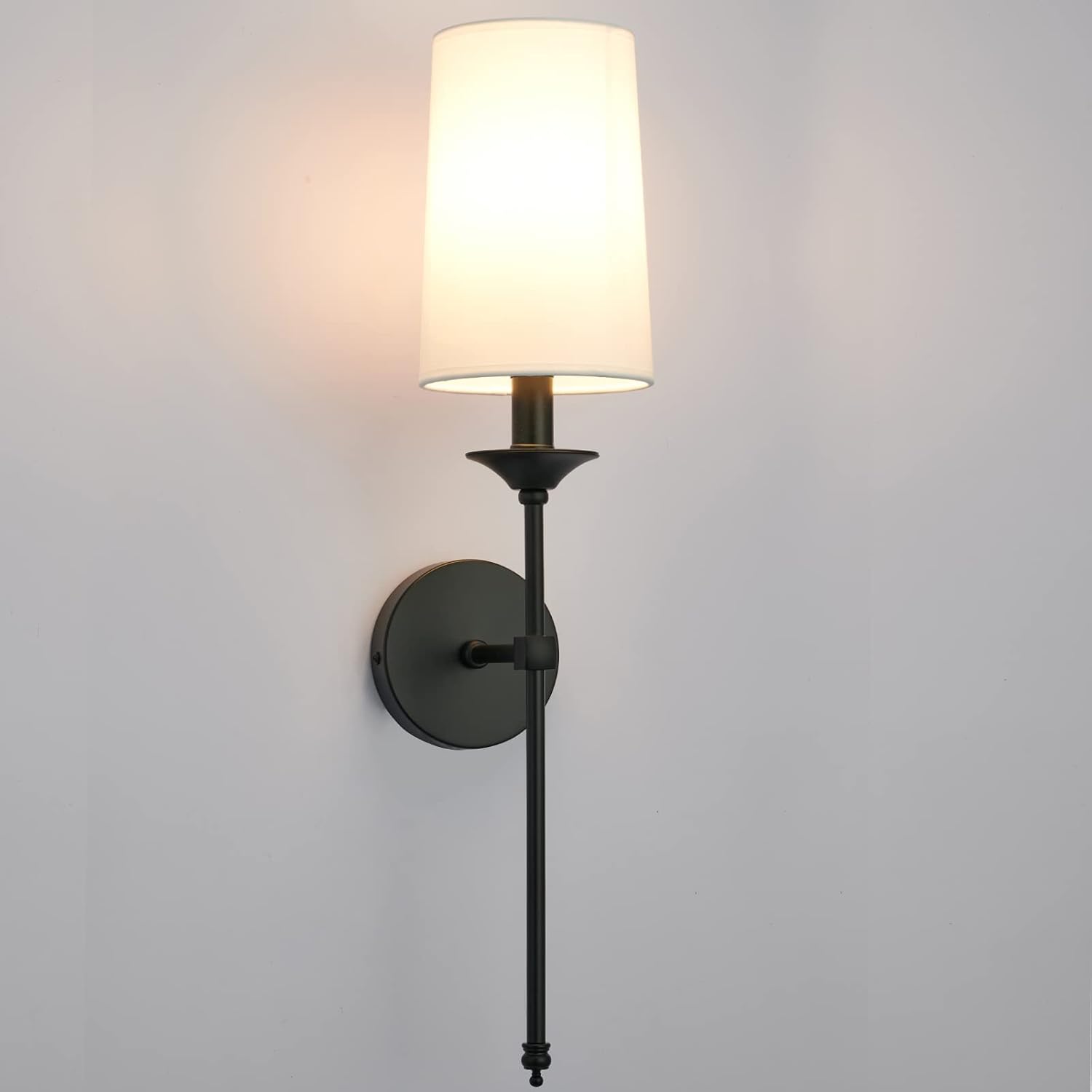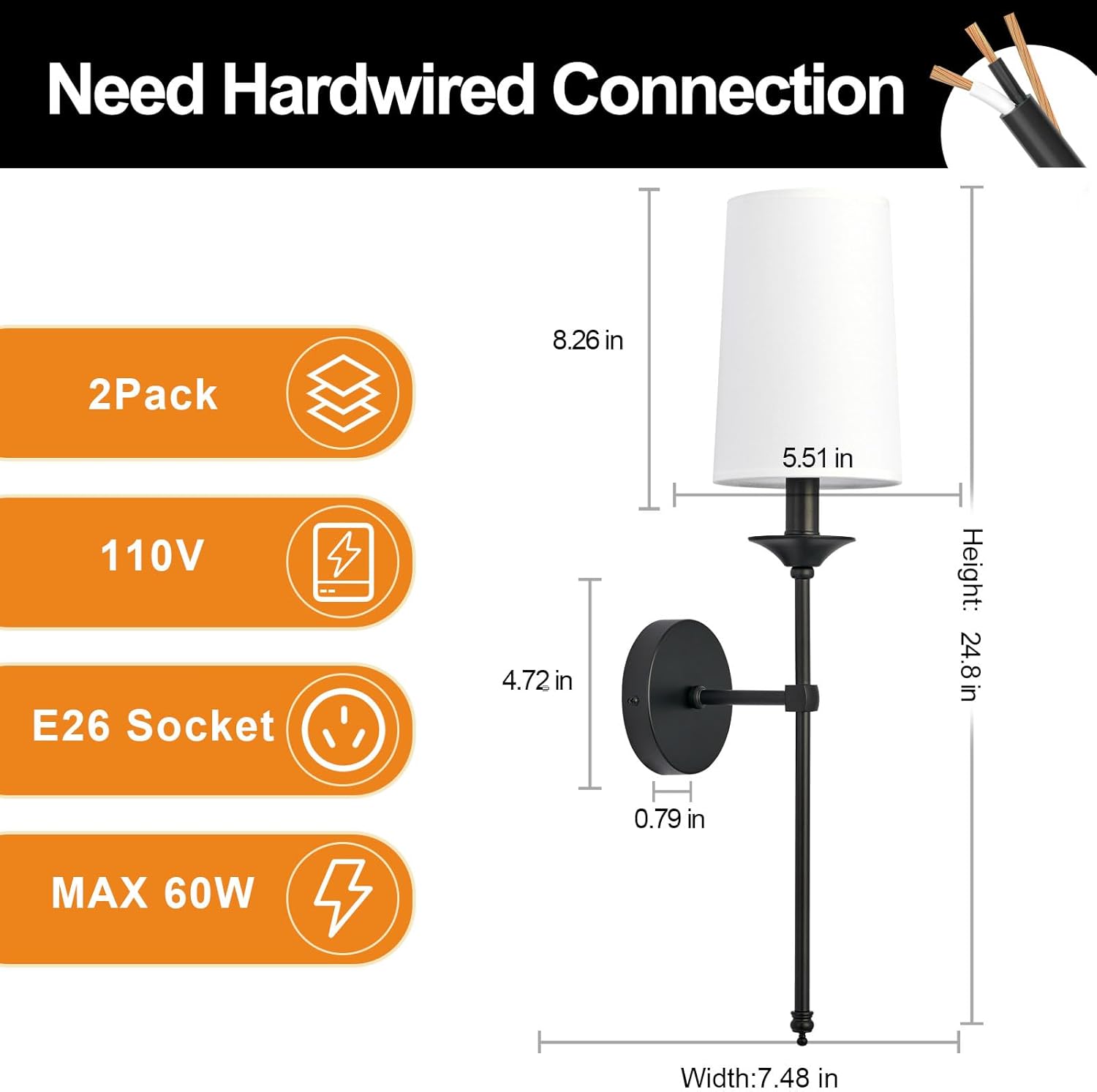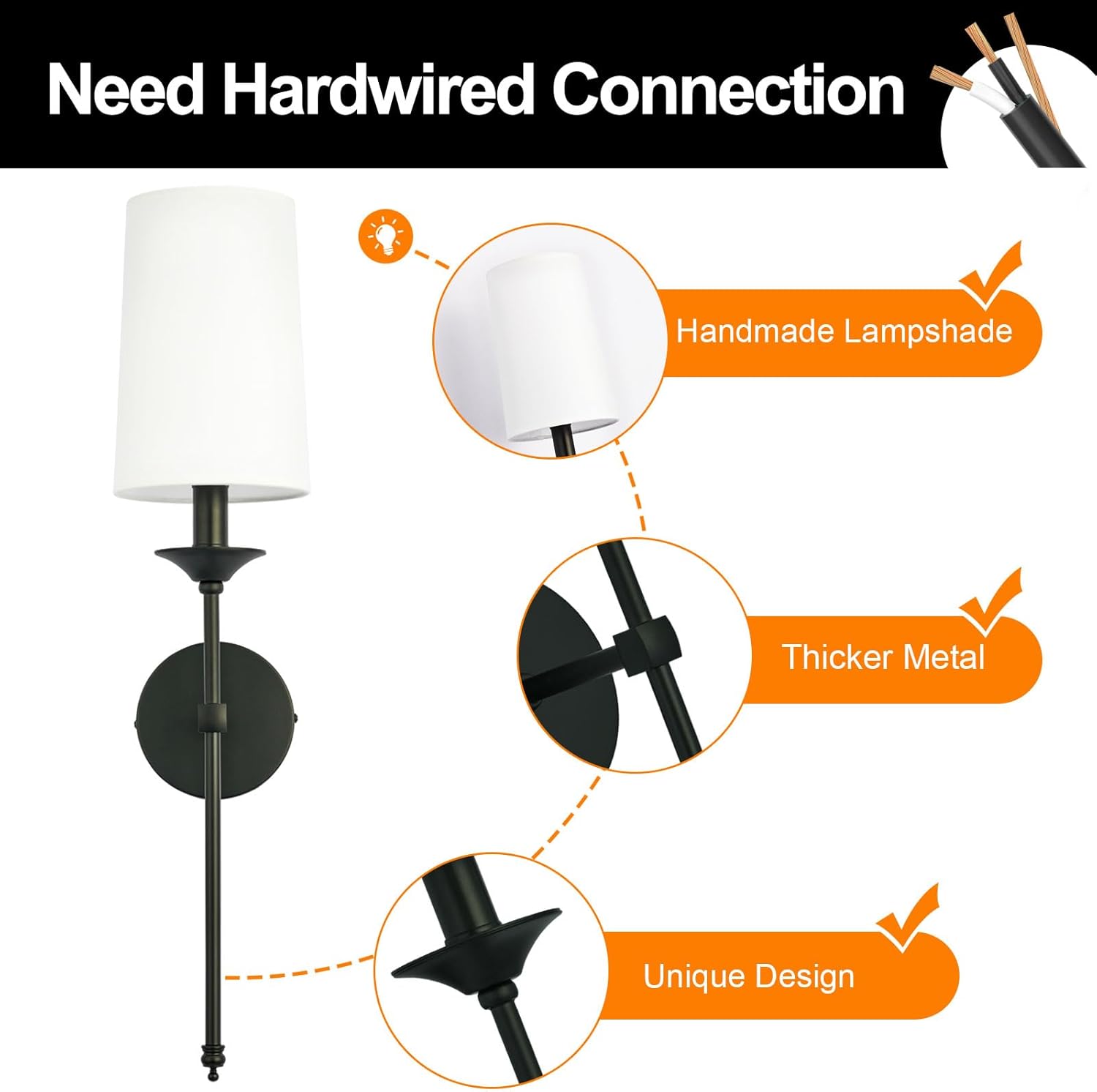 Our hardwired black candlestick wall lights set of 2 delivers elegant, vintage-inspired illumination suitable for bathrooms, bedrooms, living rooms, and hallways. Featuring sleek black poles and bases with white fabric shades, these sconces complement contemporary, industrial, and traditional interiors. Each fixture includes an E27 socket compatible with 230V and supports up to 60W LED bulbs (not included), providing warm ambient lighting. Designed for permanent installation with included mounting hardware, these durable metal wall lights offer long-lasting performance and a timeless aesthetic.