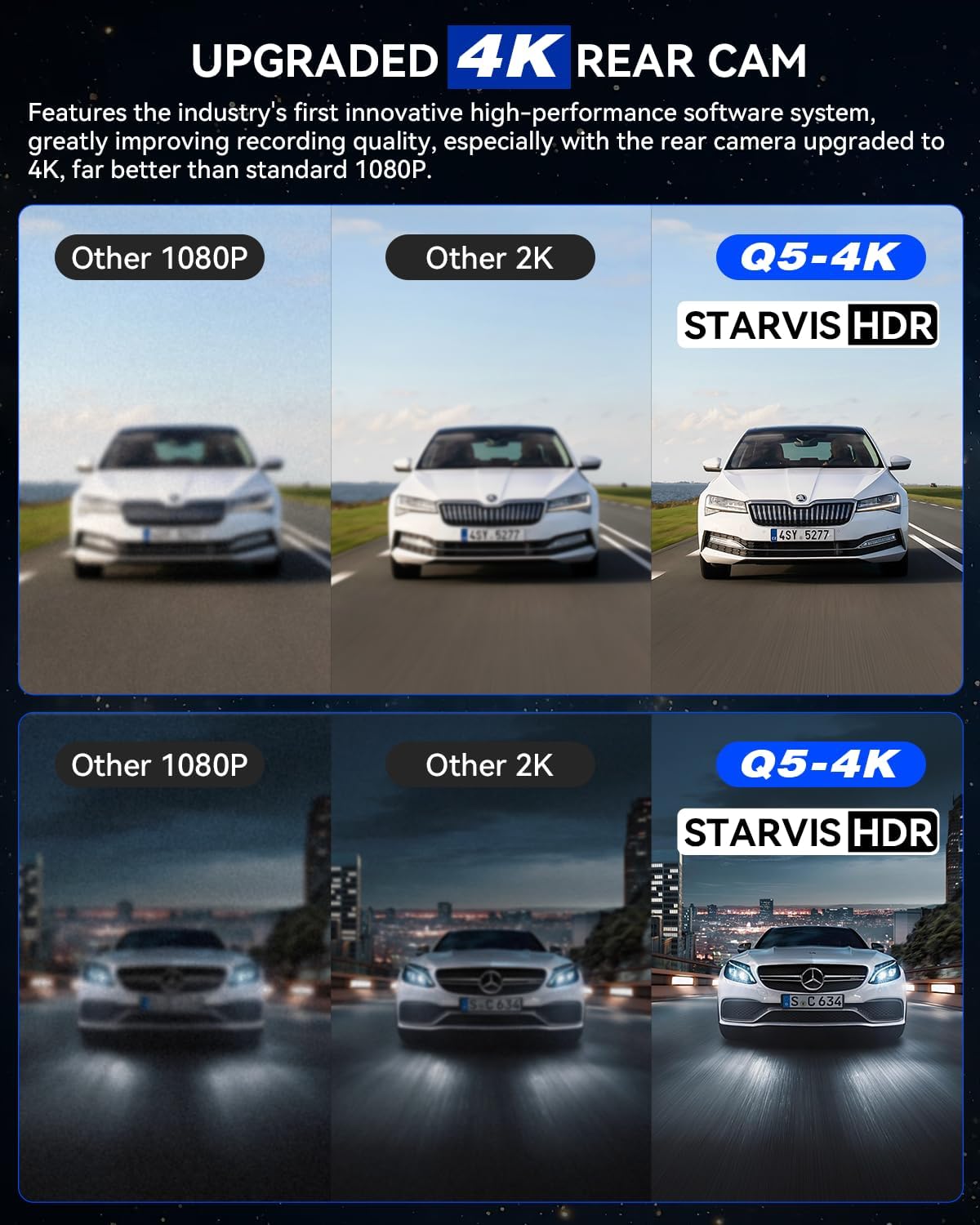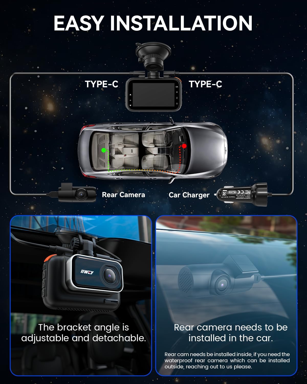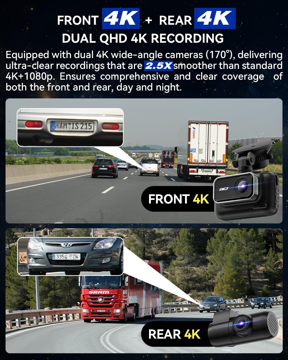Experience unmatched clarity and reliability with the IIWEY Dual Channel 4K Dash Cam (Q5) — a cutting-edge car camera designed for crystal-clear front and rear recording. Engineered with dual 4K 2160P lenses, STARVIS night vision sensors, and HDR technology, this dash cam ensures every journey is captured with precision, even in low light.