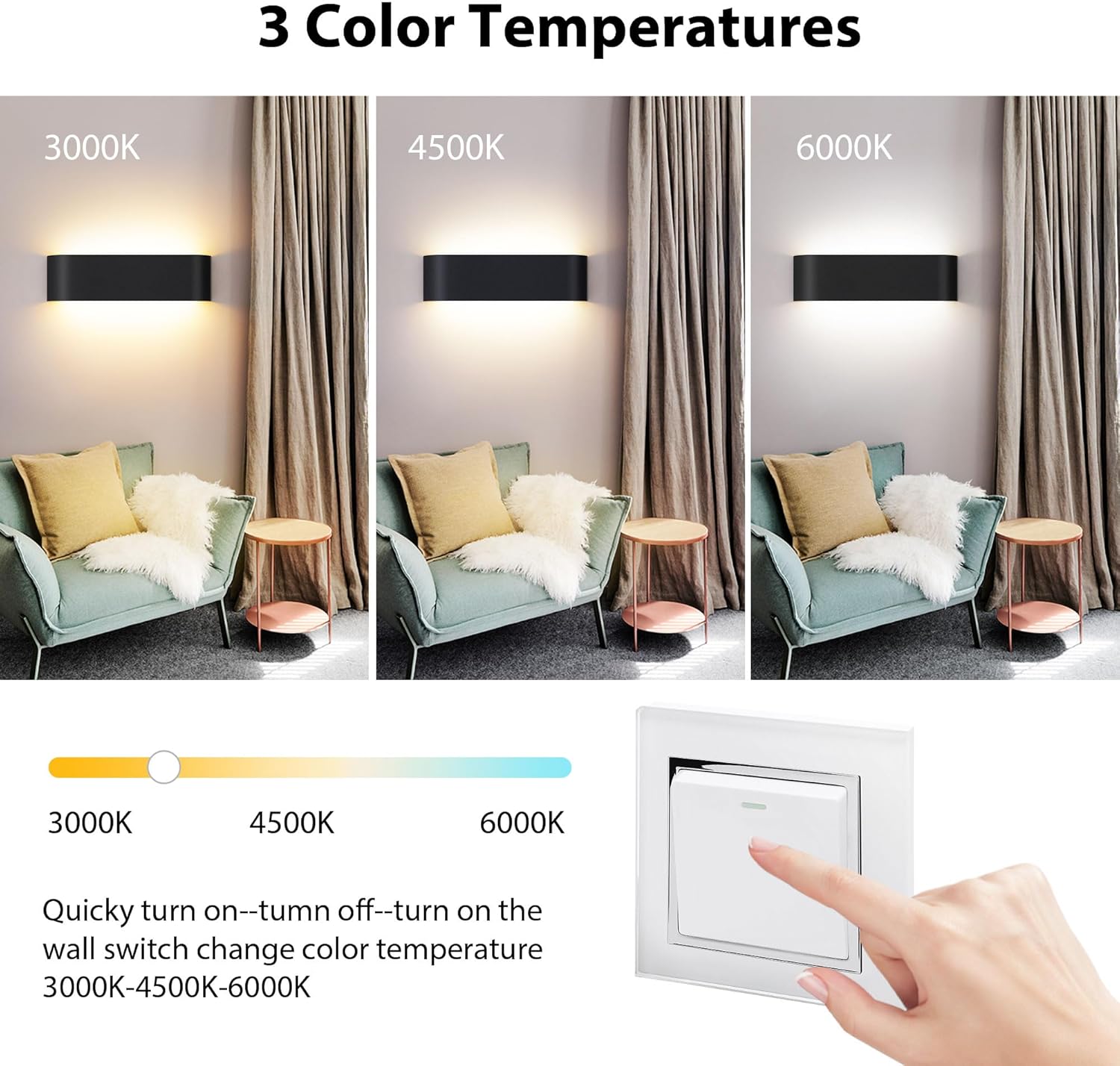 Our indoor LED wall lights feature a sleek and modern design, offering versatile illumination for bedrooms, living rooms, kitchens, dining rooms, hallways, and staircases. With adjustable up and down lighting and three selectable colour temperatures (3000K, 4500K, 6000K), these lights provide high brightness while protecting your eyes. Constructed with durable aluminum and sturdy acrylic, the lamps ensure effective heat dissipation, long-lasting performance, and an elegant aesthetic suitable for any interior setting.