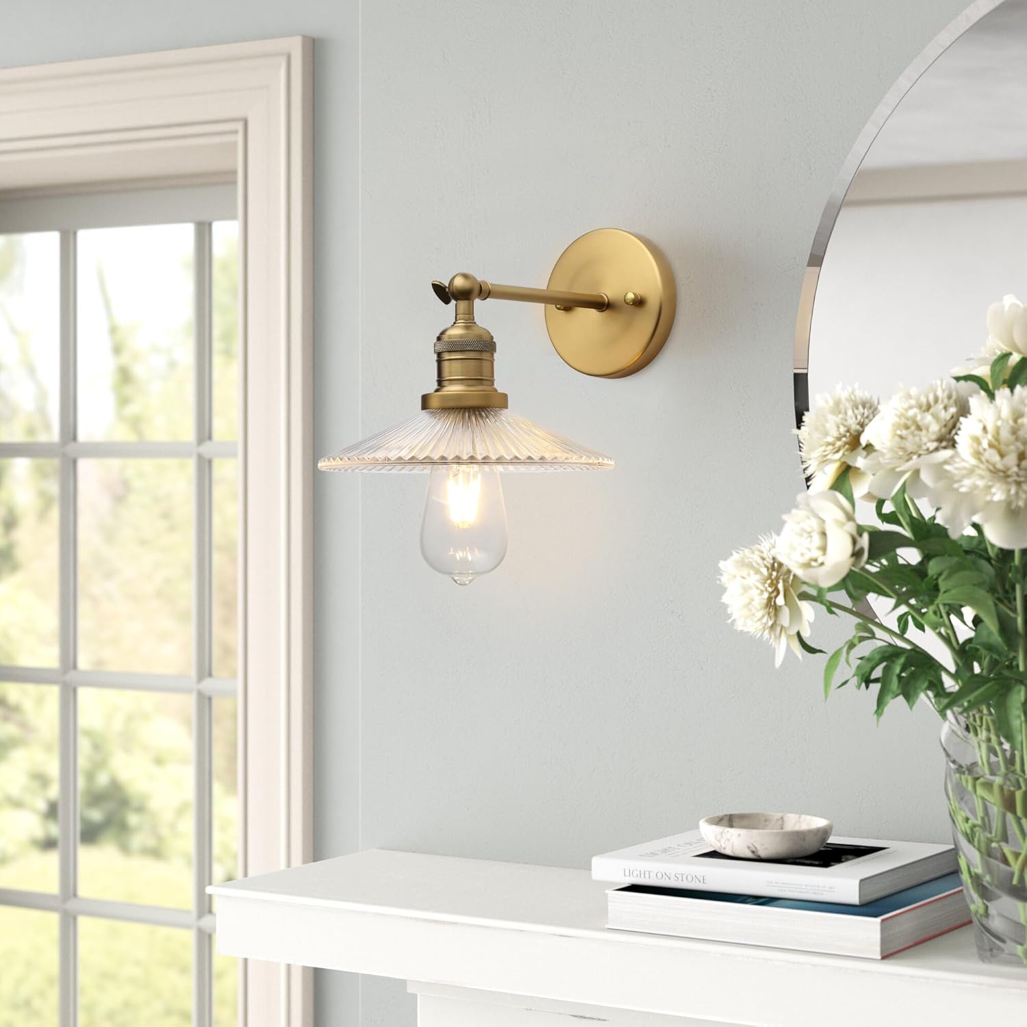 Our industrial vintage 1-light wall sconce combines retro charm with modern craftsmanship, featuring a funnel ribbed clear glass shade and antique brass finished metal holder. Designed for indoor use, it accommodates E27 bulbs up to 40W, compatible with LED, CFL, Edison, or incandescent bulbs. This hardwired wall-mounted lamp provides adjustable uplight and downlight illumination, perfect for living rooms, bedrooms, bathrooms, or above kitchen sinks, while its unique handcrafted design serves as both functional lighting and decorative art for any interior space.