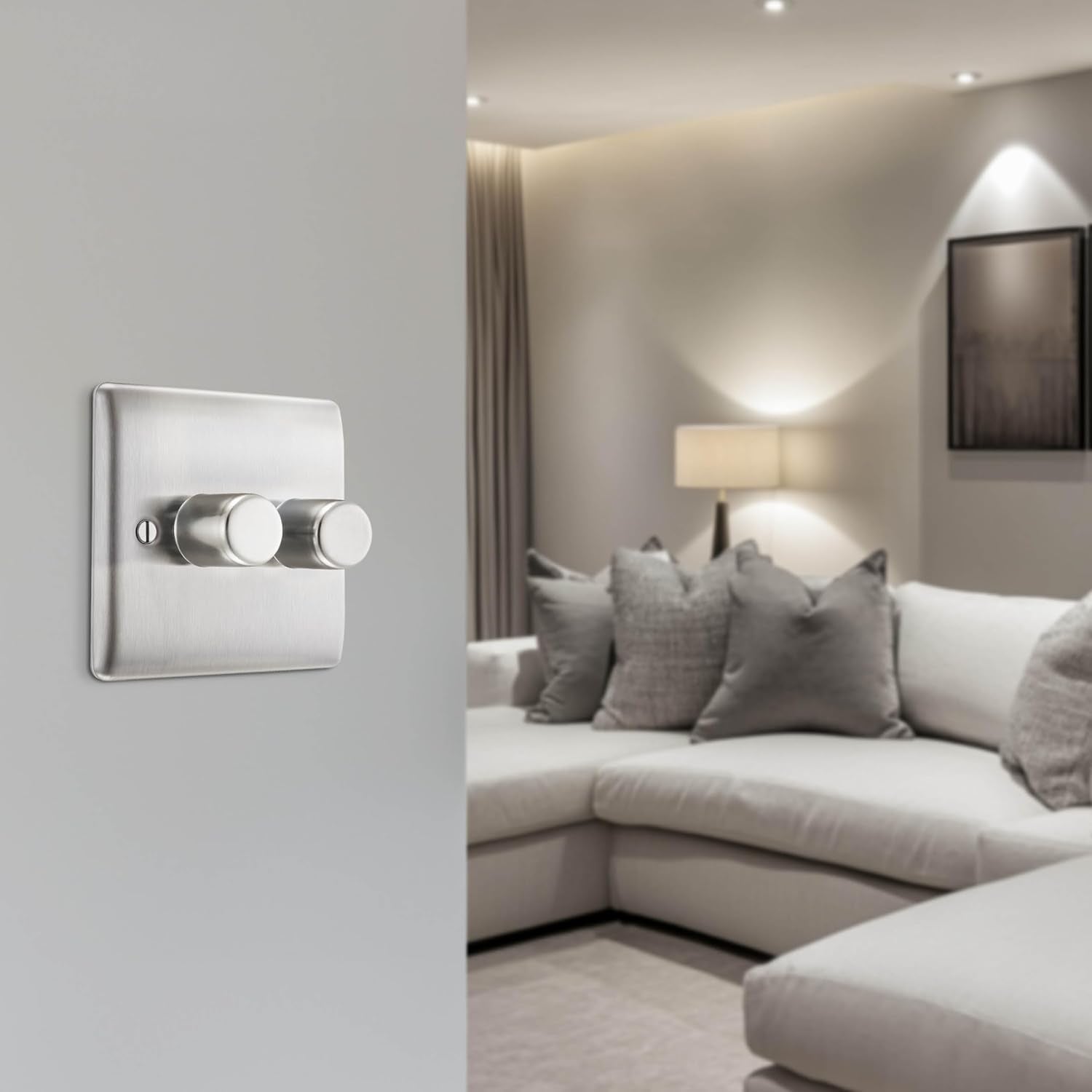 Our intelligent double wall dimmer switch with 200W capacity, 2-way switching, and brushed steel raised profile from the BG Nexus Metal range delivers smooth, reliable control for LED, CFL, and traditional lights. Featuring a trailing-edge dimmer with soft-start for extended bulb life, integrated moisture gasket protection to prevent tarnishing, and overload protection for safe operation, this switch combines style with performance in a slim, decorative design with softly rounded edges.