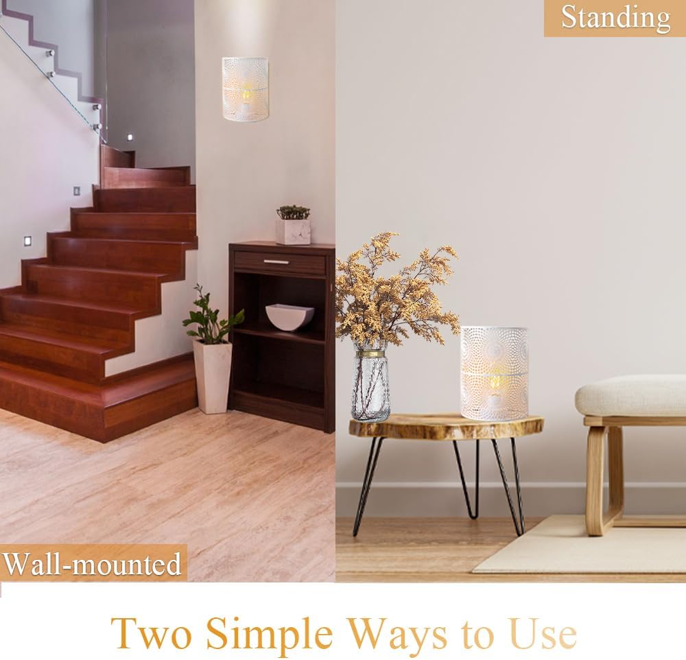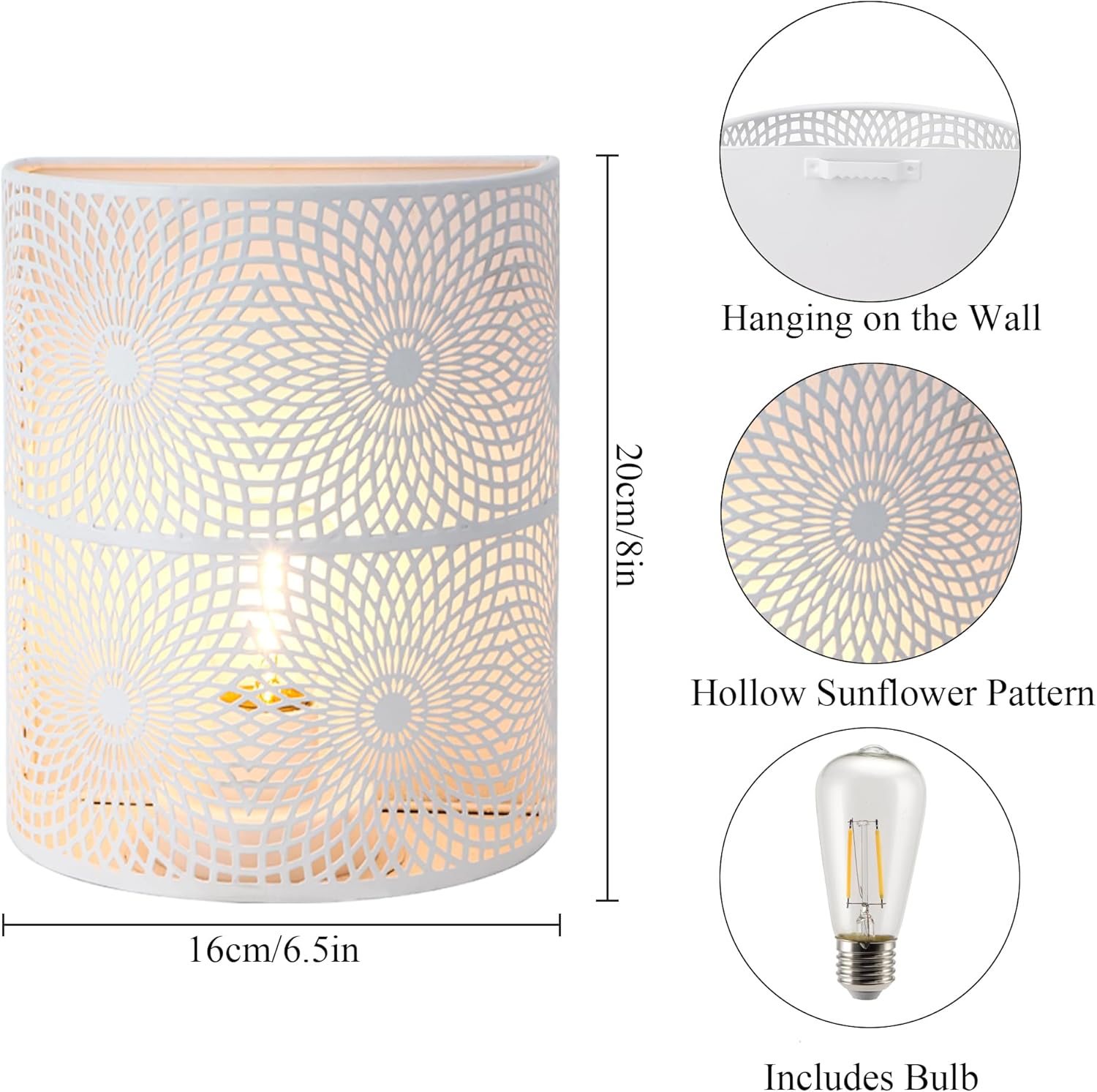 Our JHY DESIGN Set of 2 battery powered table lamps combines modern and vintage wall sconce design with practical functionality, offering a versatile lighting solution for any space. Crafted from durable metal with a matte white finish, the sunflower-shaped hollow pattern emits a warm, comfortable glow. Each lamp measures 16 x 10 x 20 cm and is powered by 3 x AAA batteries (not included), allowing use as a wall-mounted sconce or a standalone table lamp without wires. Featuring a 6-hour timer, these energy-efficient LED lamps provide long-lasting illumination, ideal for living rooms, bedrooms, hallways, or stairways, while adding a stylish decorative touch.