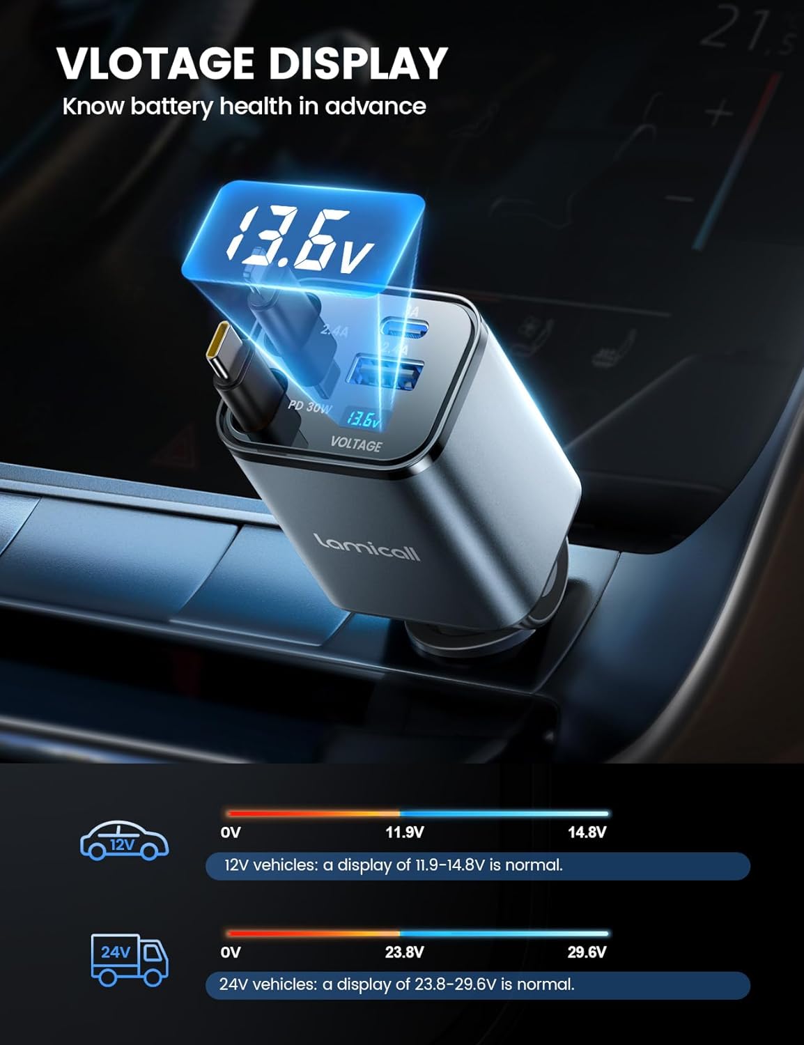 Our Lamicall 4-in-1 Retractable Car Charger Adapter 69W is a compact and versatile charging solution designed to keep your devices powered on the go. With a retractable 30W Type-C cable, a 12W retractable cable for iPhone 14 and earlier models, a 15W USB-C port, and a 12W USB-A port, it allows simultaneous charging of up to four devices. The integrated voltage display monitors your car's real-time voltage, ensuring safe and stable charging. Built with premium ABS material, it is durable, scratch-resistant, and provides effective heat dissipation. The 180° adjustable design and retractable cables prevent obstruction around gearshifts and cup holders, keeping your car interior organized and safe while driving. Compatible with a wide range of smartphones and tablets, including iPhone, Samsung, Google Pixel, Xiaomi, and more, this charger combines convenience, safety, and efficiency in a compact design.
