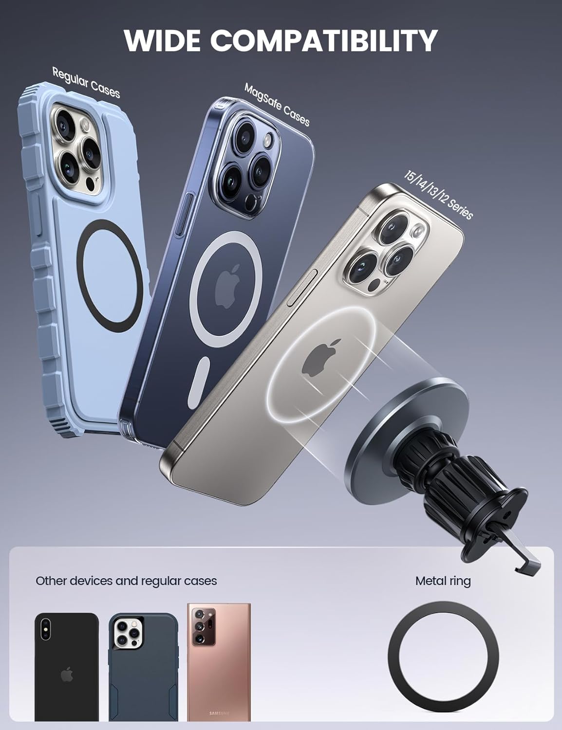 Compact, lightweight, and 360° rotatable, this mount allows seamless one-handed adjustments for both horizontal and vertical viewing angles. Compatible with iPhone 17, 16, 15, 14 Pro/Max/Plus/Air and magnetic cases, the holder also works with other devices via the included metal ring. Its elegant design is perfect for any car interior, making it an indispensable car accessory for tech-savvy drivers.