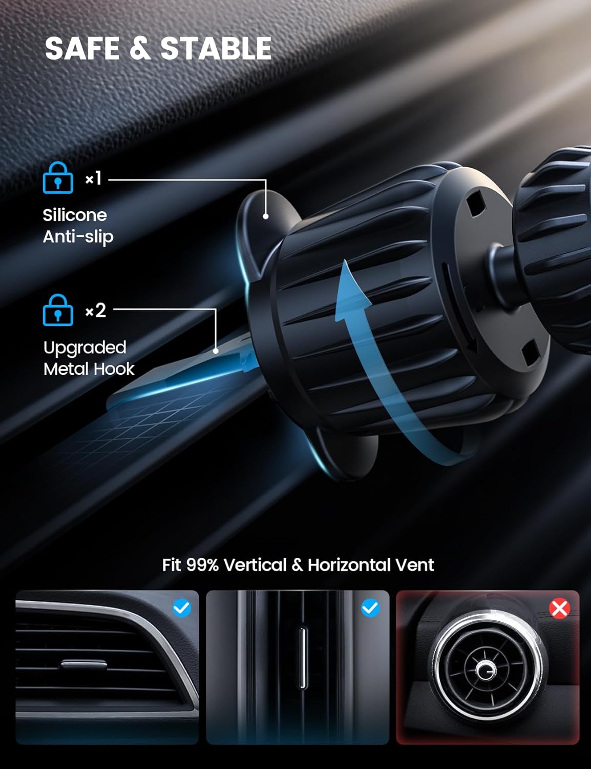 Equipped with 20 x N52 powerful magnets, it provides an unshakable grip, securely holding up to 10 iPhone 16 devices, even on bumpy roads or during sudden stops. Its innovative triangular metal hook design combined with soft silicone ensures triple locking protection, giving you unparalleled stability and confidence while driving.