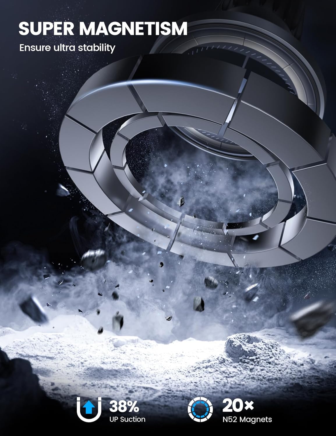 Engineered with 20x N52 powerful magnets, the mount ensures superior magnetic retention, keeping your device secure even during sudden stops or uneven roads. The upgraded shorter and sturdier arm minimizes wobbling and airflow obstruction, while the 360° rotatable design allows effortless adjustment between portrait and landscape modes.