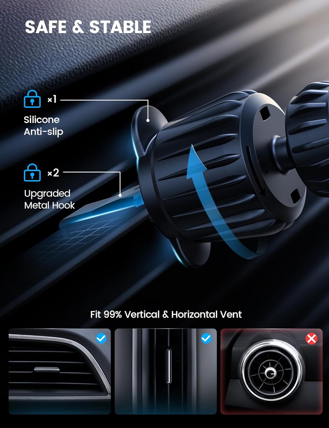 I've used multiple car mounts before, but the Lamicall MagSafe Car Mount blew me away. The 20x N52 magnets hold my iPhone 16 Pro Max firmly, even on bumpy roads. I love the 360° rotation, allowing me to switch between portrait and landscape effortlessly. The metal hook with silicone padding fits perfectly on my slatted vents without scratching them. This mou