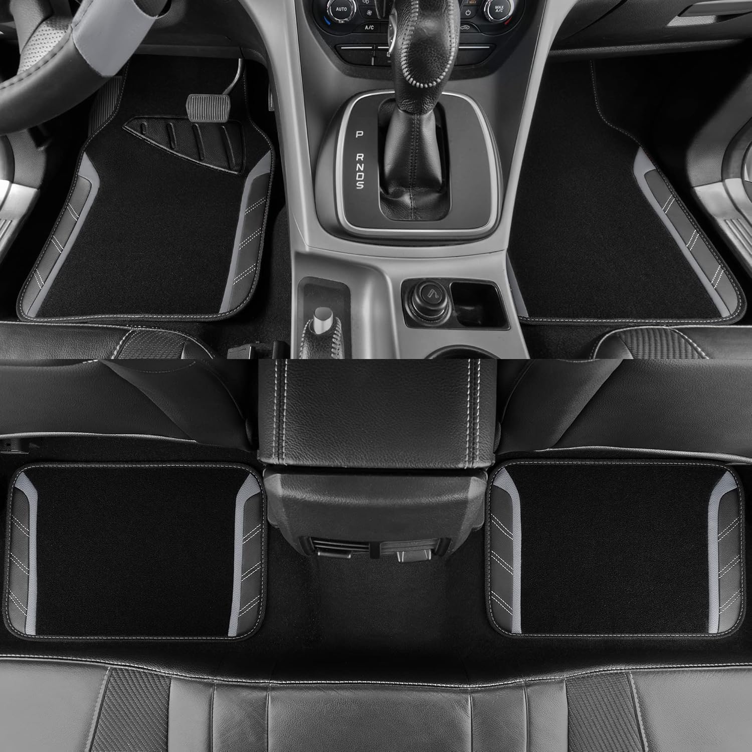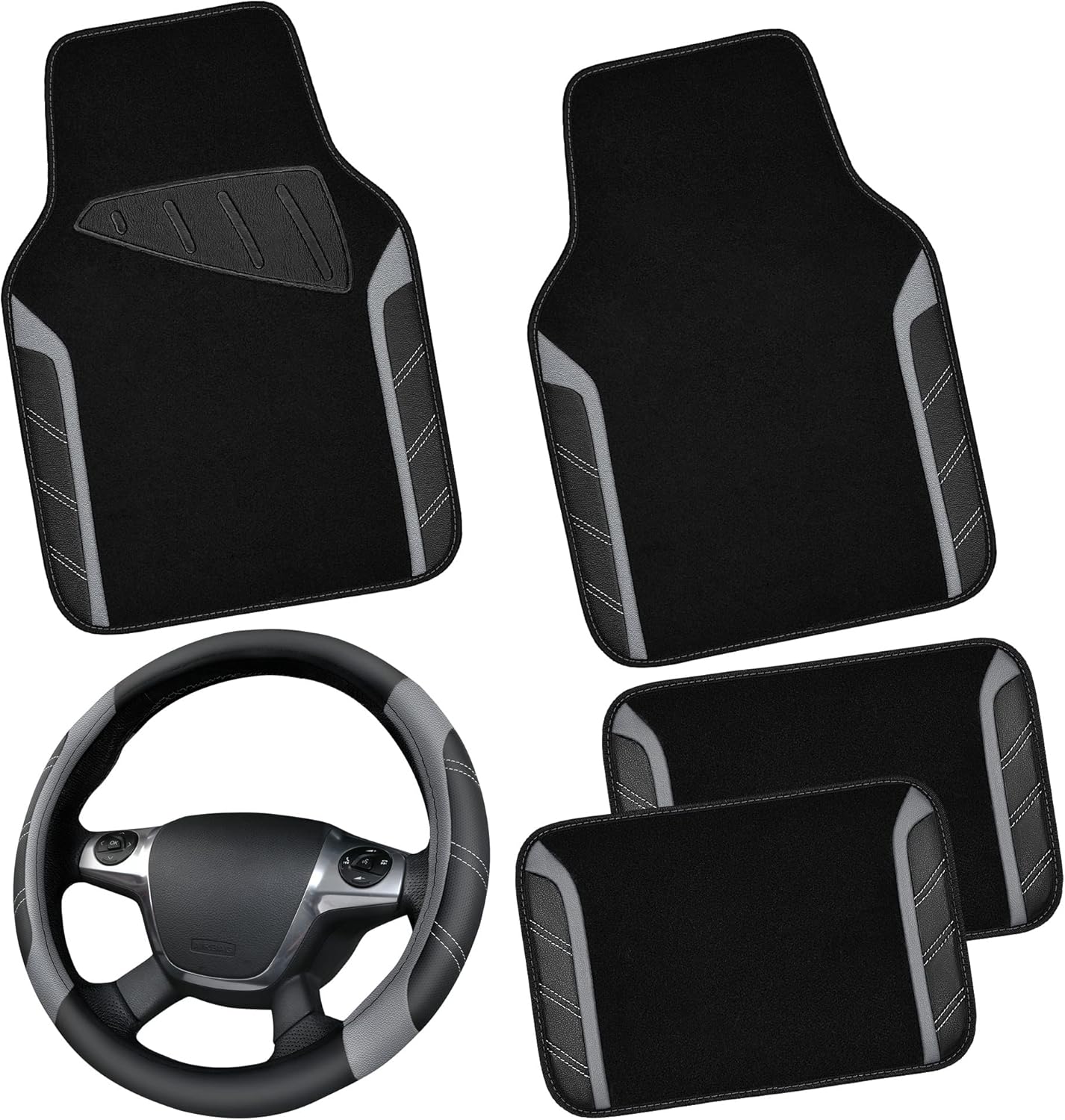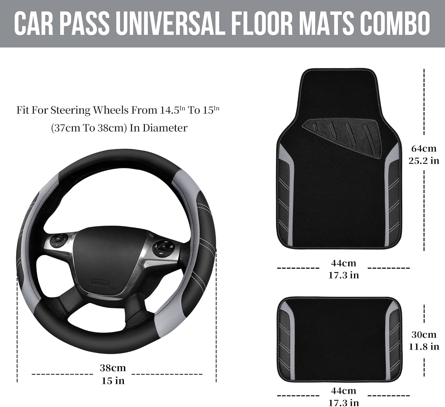 Our CAR PASS Leather Steering Wheel Cover and Waterproof Car Floor Mats set combines premium quality, comfort, and protection in one complete package. Crafted from durable microfiber leather and odorless TPR inner grip, the steering wheel cover enhances your driving experience by providing a non-slip, comfortable grip that ensures safety and control. The waterproof floor mats are designed with heavy nibbed backing to stay securely in place, protecting your vehicle’s interior from dirt, moisture, and wear. Suitable for 95% of sedans, SUVs, and cars, this universal combo fits steering wheels sized 14.5"–15" and offers reliable protection with a stylish sporty design in black and gray.
