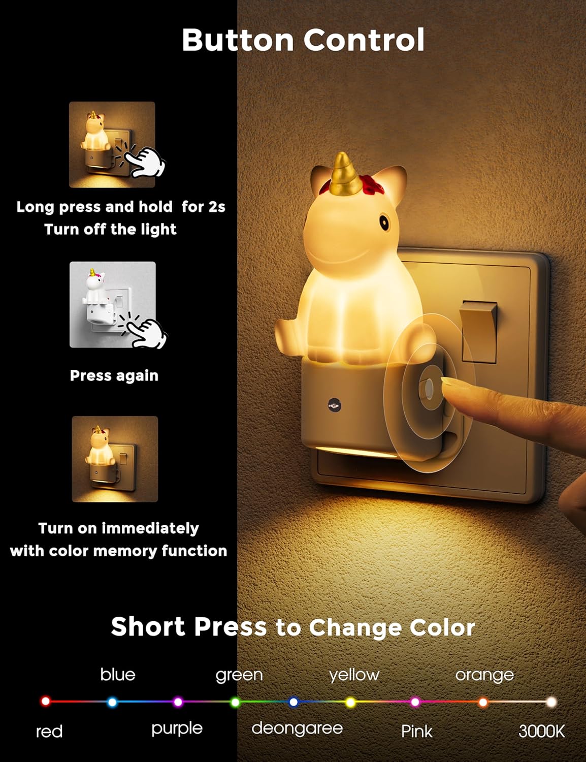 Our LED Night Light Plug in Wall with 3D Cute Design combines charm, practicality, and advanced functionality. Featuring a dusk to dawn sensor, it automatically turns on at night and off in the morning, ensuring hands-free convenience. With RGB colors plus a soothing 3000K soft white glow, it offers three lighting modes and adjustable brightness for the perfect ambiance. The built-in memory function remembers your last setting, so there’s no need to re-adjust every time. Durable and cozy, this plug-in night light creates a calming atmosphere for children, adults, and seniors alike—perfect for bedrooms, nurseries, bathrooms, hallways, and stairways.