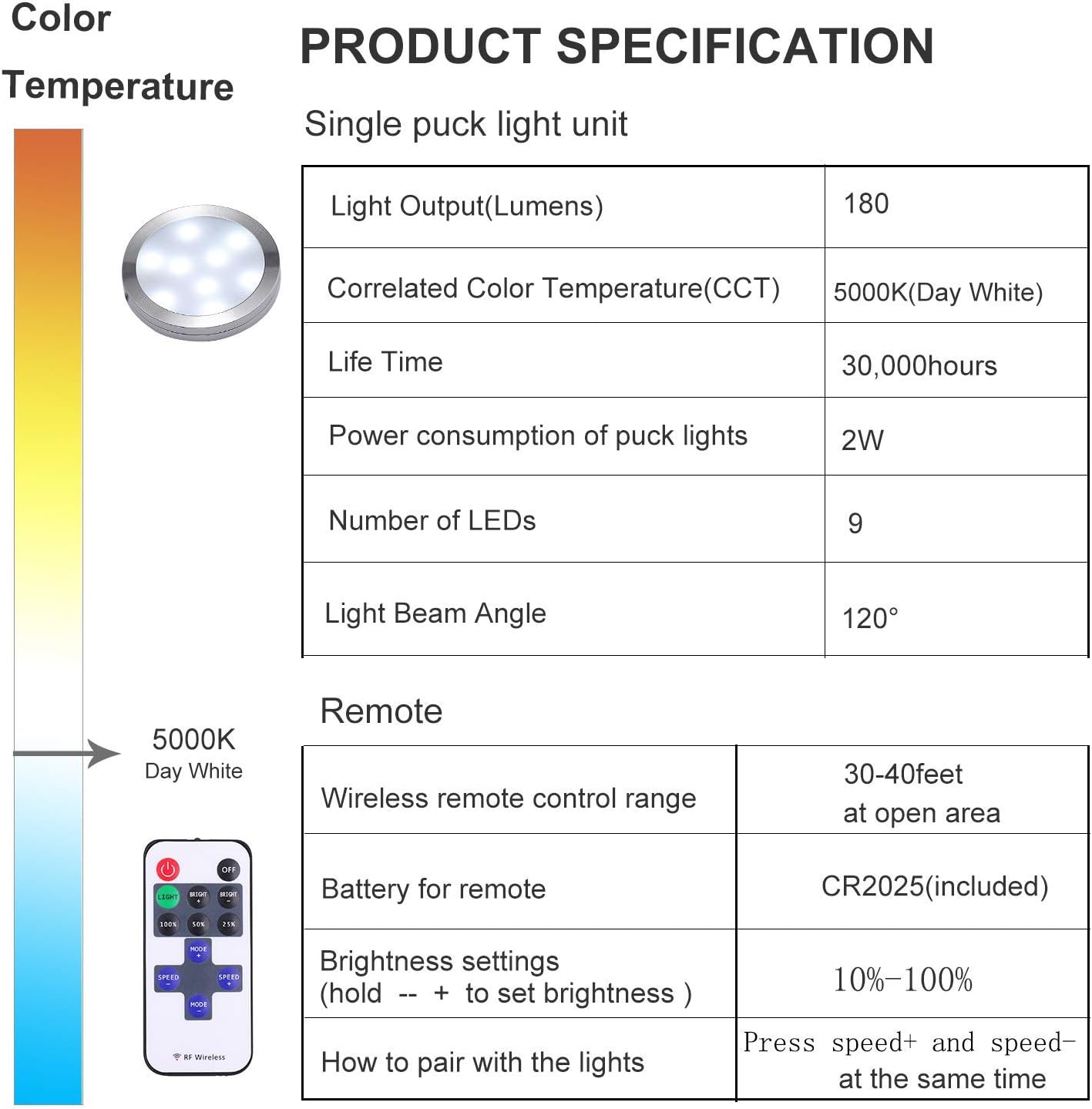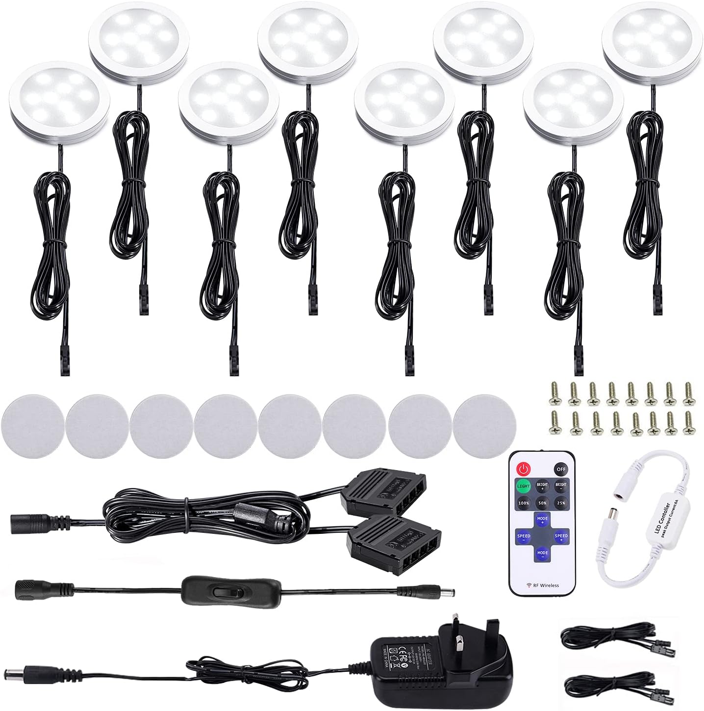 Upgrade your kitchen, workspace, or display area with this 8-pack LED under cabinet lighting kit. Featuring dimmable 6000K daylight white LEDs, these lights offer adjustable brightness from 0 to 100%, allowing you to create the perfect atmosphere for cooking, reading, or showcasing items. The slim puck design (2.3 × 0.31 inches) ensures a low-profile, invisible installation that blends seamlessly under cabinets, shelves, or cupboards. Controlled via RF wireless remote, the lights retain your preferred settings and can pass signals through walls or cabinets for ultimate convenience. Installation is simple with included double-sided tape, screws, and a central hub for flexible multi-shelf setups. Made with durable aluminum alloy and acrylic, these energy-efficient lights deliver 600 lumens with a long 40,000-hour lifespan. Perfect for kitchens, closets, bookcases, workspaces, or display shelves, they combine style, function, and versatility.