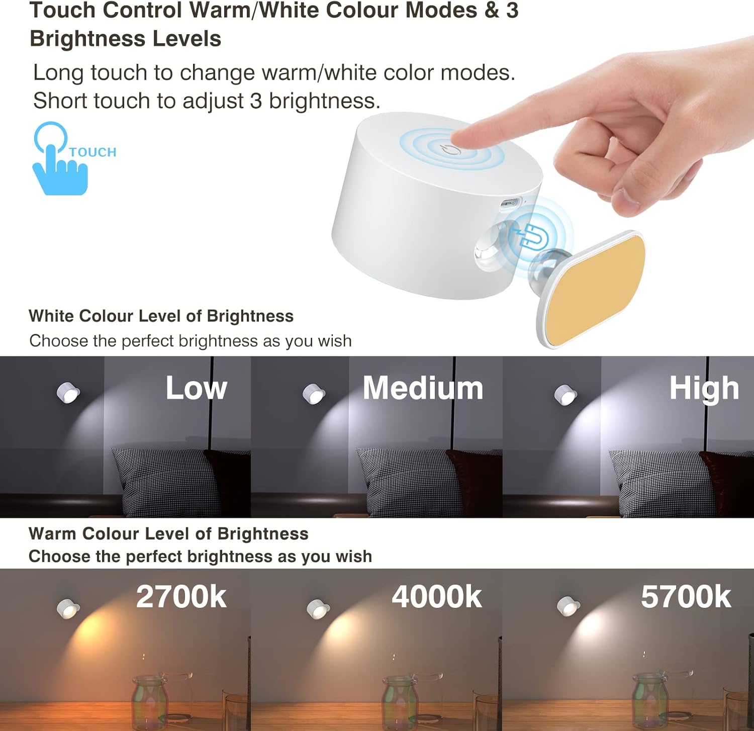 Our rechargeable LED wall light is designed to deliver focused and adjustable illumination for bedside reading, cabinets, and indoor accent lighting. Featuring responsive touch control with three brightness levels and three selectable colour modes, this compact wall spotlight supports comfortable lighting for a variety of daily scenarios. The 360-degree rotatable magnetic head allows precise light direction, while the built-in rechargeable battery with USB and Type-C charging provides reliable cordless performance with simple, damage-free installation.