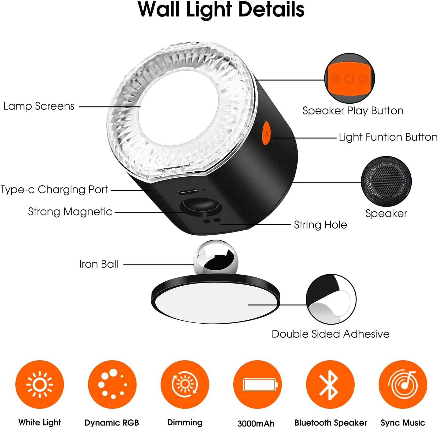 Our LED wall mounted light with integrated Bluetooth speaker is designed to enhance modern interiors with both atmospheric lighting and immersive sound. Featuring a 3000mAh rechargeable battery, this cordless wall sconce delivers up to 24 hours of illumination at medium brightness and functions as a portable music-enabled light source. With three selectable white light tones, multiple RGB lighting modes, smooth dimming control, and 360° magnetic rotation, it provides flexible placement and precise light direction for bedrooms, hallways, and ambient living spaces.