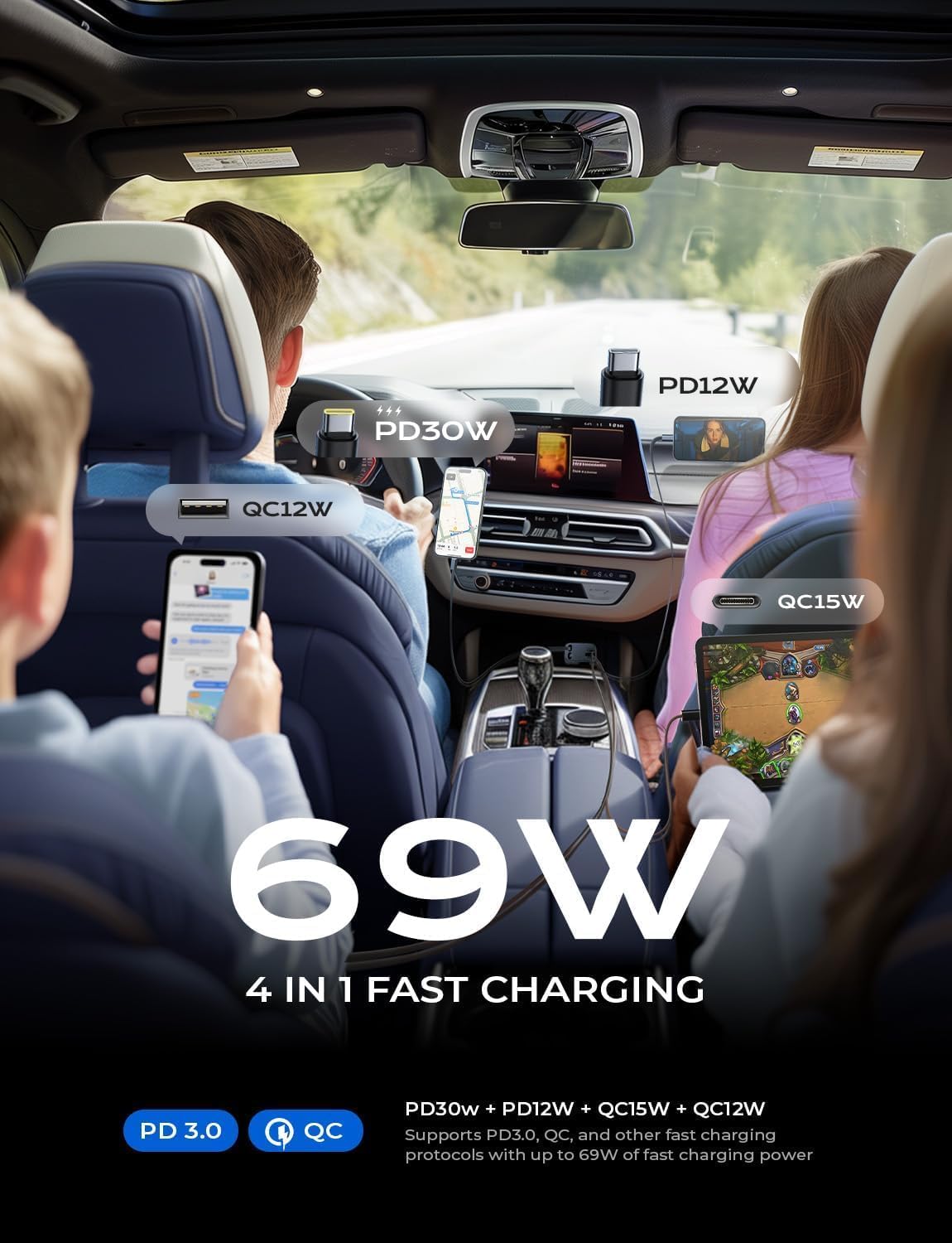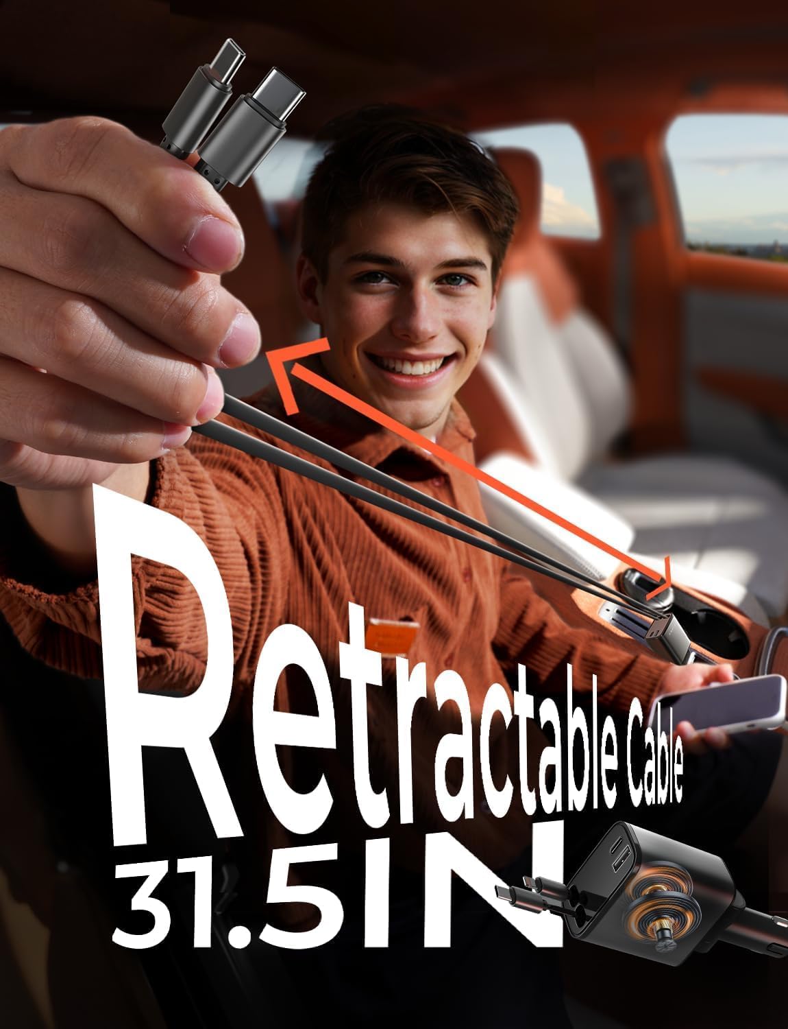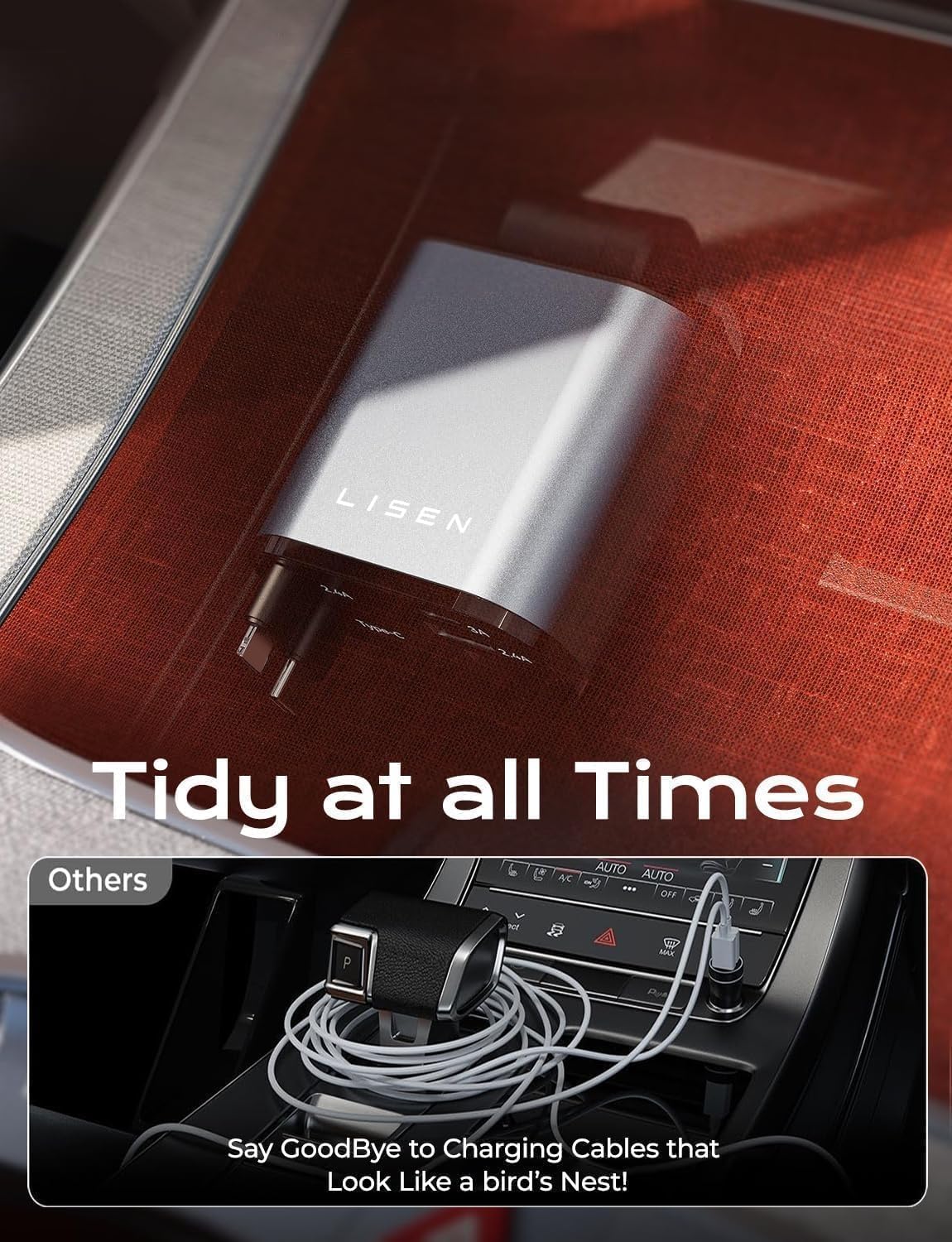 Experience lightning-fast charging and clutter-free convenience with the LISEN Retractable Car Phone Charger. Designed for modern drivers, this 69W USB-C fast car charger powers up to four devices simultaneously, ensuring your gadgets stay charged during every journey. Featuring dual retractable Type-C cables and both USB-C and USB-A ports, it delivers up to 30W PD fast charging — perfect for iPhone 17 Pro Max, Samsung Galaxy S25 Ultra, and other latest smartphones.