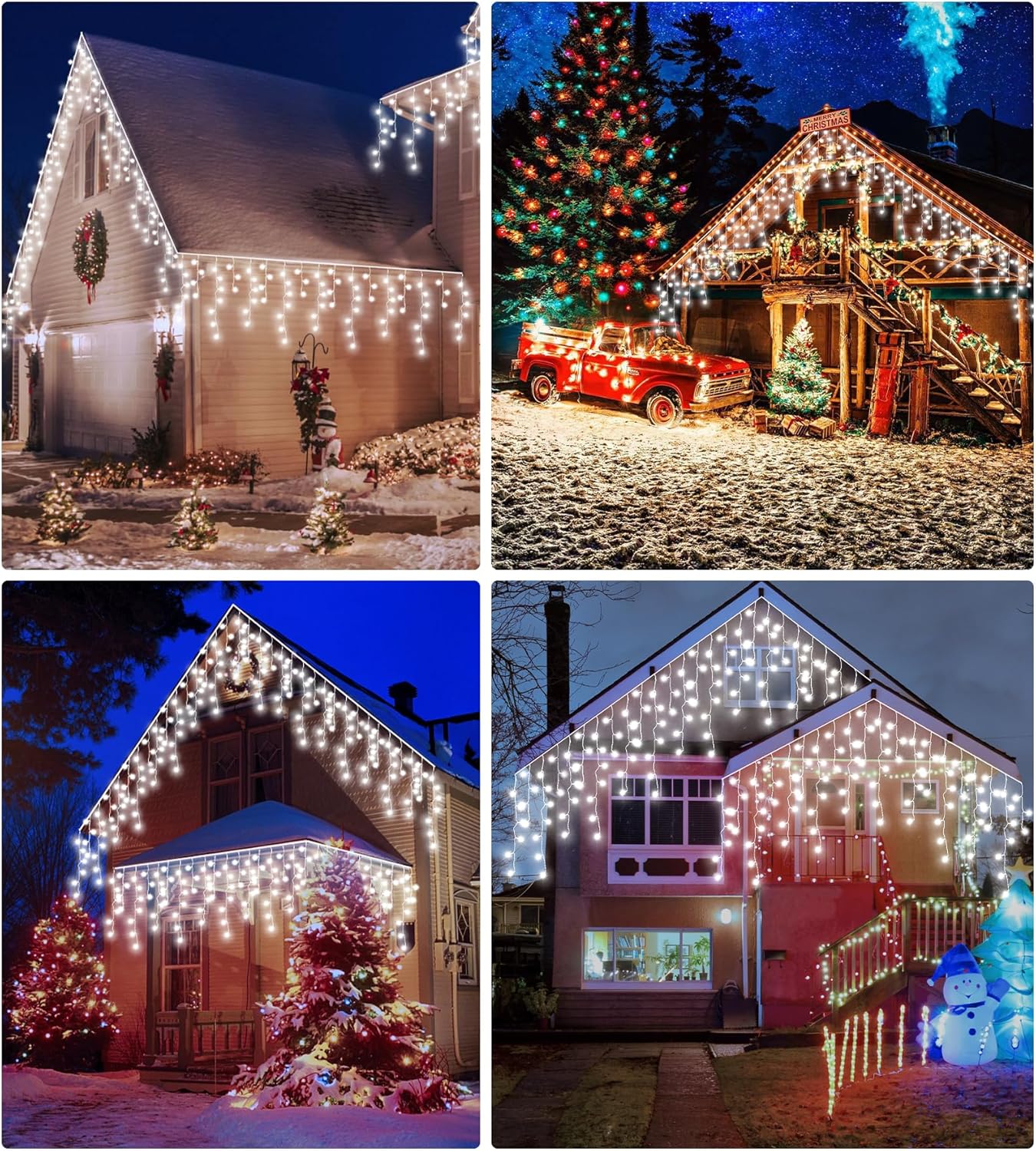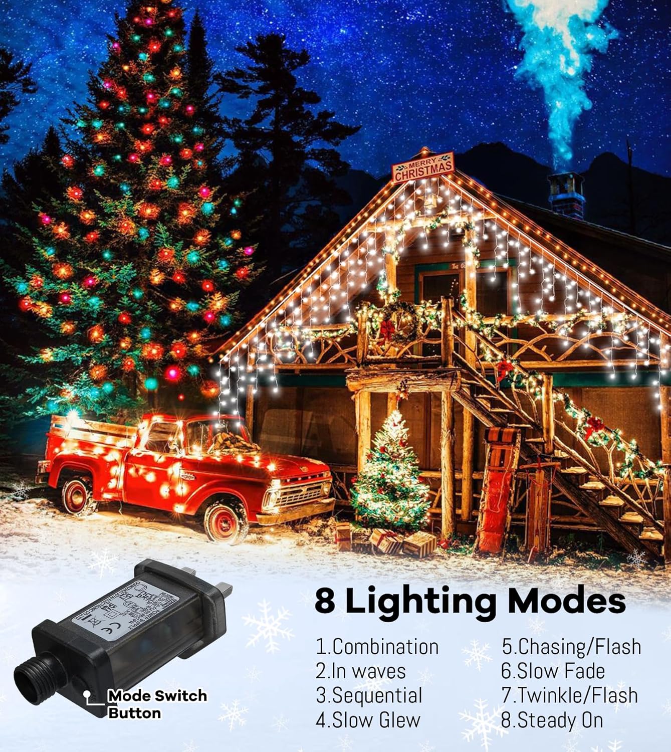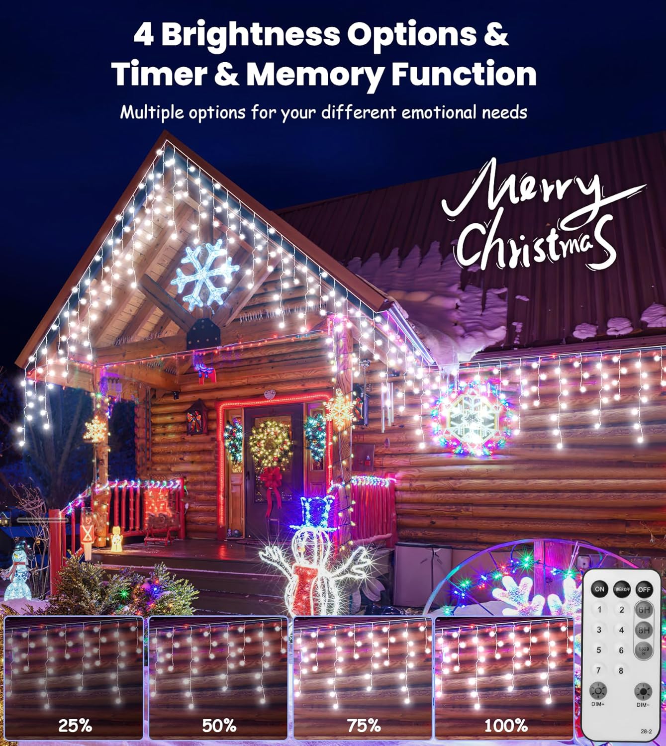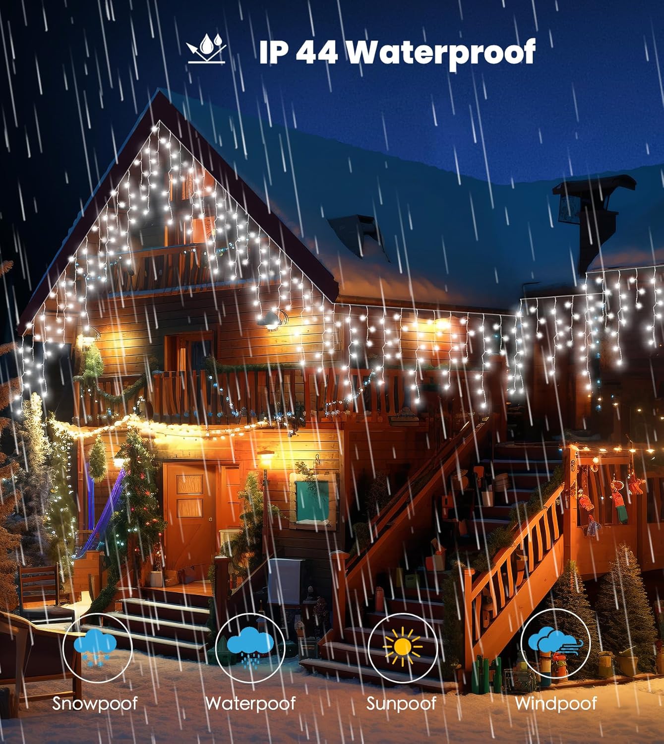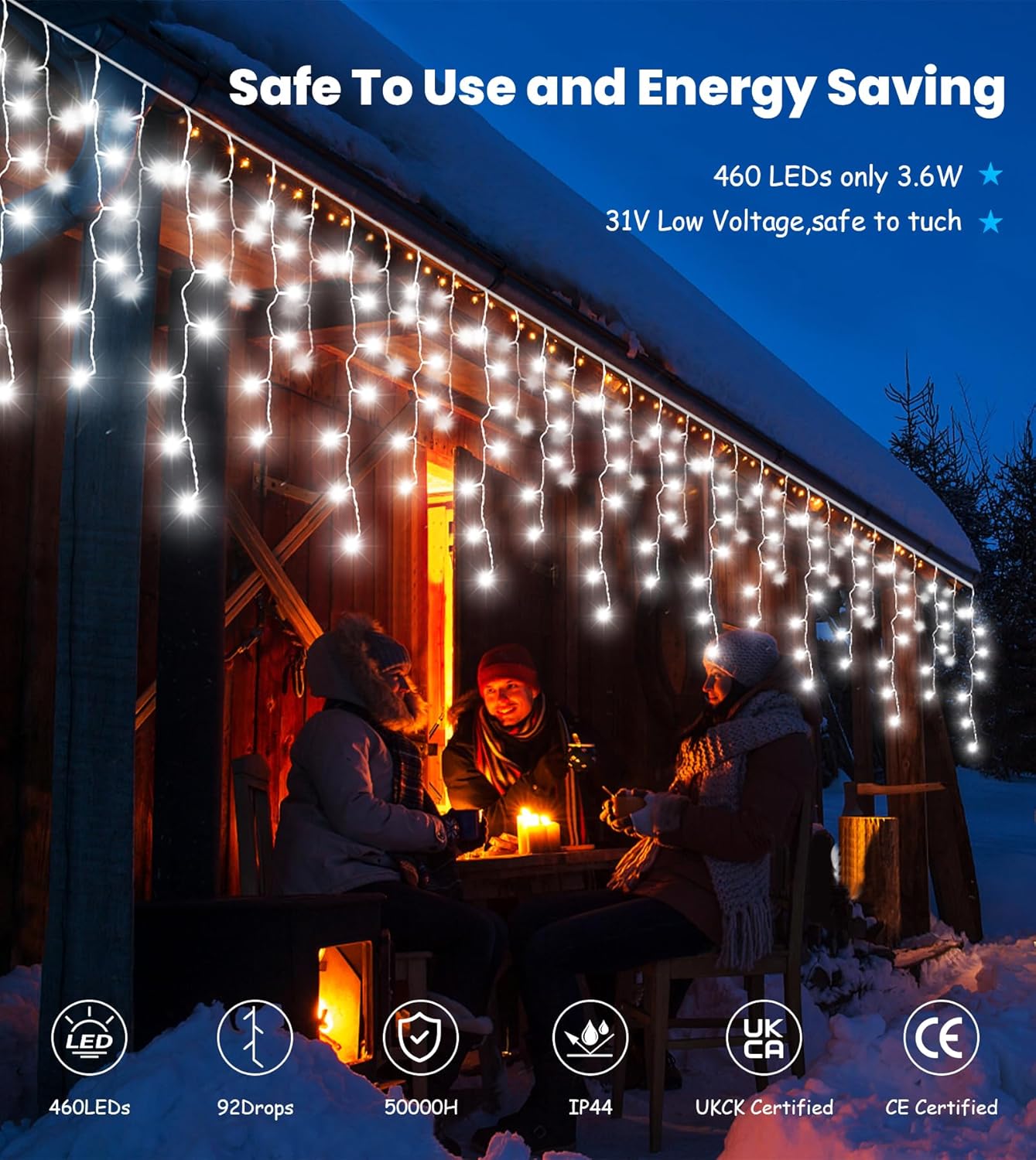 Our LITOHOM Icicle Outdoor Christmas Lights 460 LEDs 17.5M Cool White are the ultimate choice for creating a magical festive atmosphere. With a bright, cool white glow and 92 vertical drops, these icicle lights beautifully frame roofs, windows, and gardens, transforming any outdoor space into a winter wonderland. Featuring 8 lighting modes, a built-in timer, and memory function, these lights make decorating effortless and energy-efficient. The low 31V voltage ensures safety for families and pets, while the IP44 waterproof design provides reliable outdoor performance, even in wet weather. Complete with a handy remote control, this set offers convenience, durability, and stunning illumination.