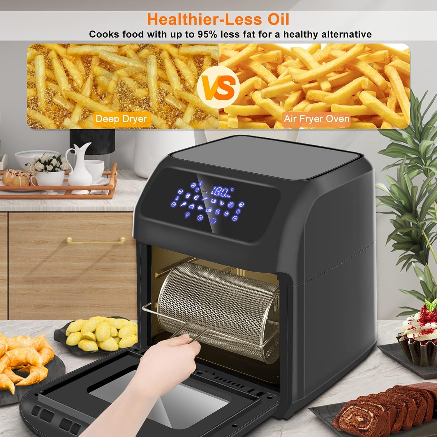 12 Cooking Modes – Choose from presets including chips, steak, fish, shrimp, pizza, drumstick, cake, rotisserie, dehydrator, preheat, frozen food, and reheat.