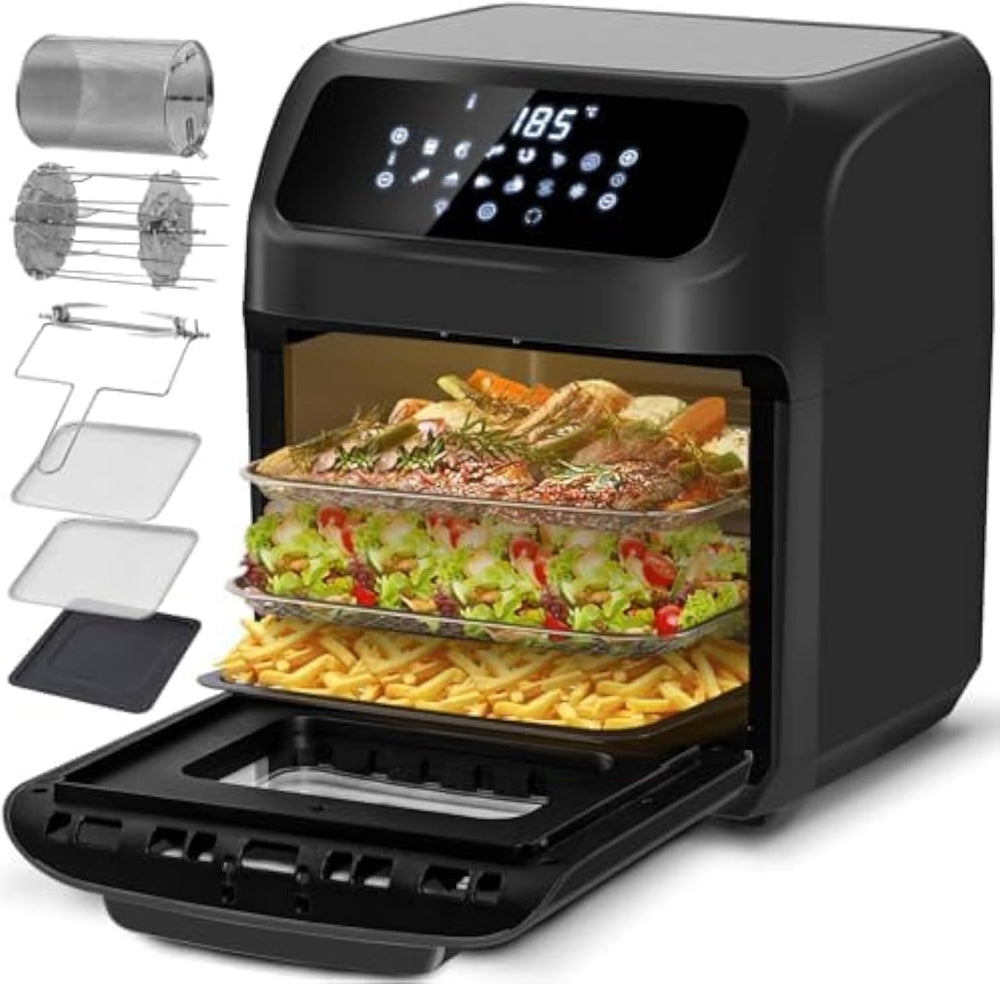 Complete Accessory Set – Includes 2 cooking trays, 1 rotating basket, 1 drip tray, 1 skewers rack, 1 rotisserie fork, and 1 food tong.