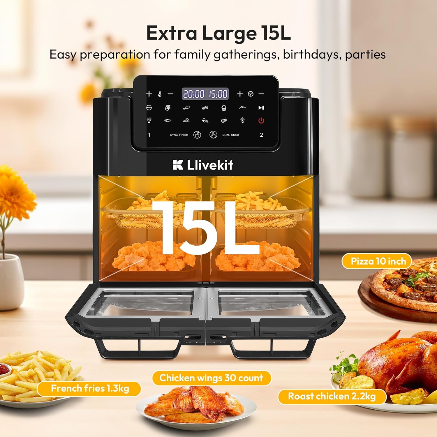 Our LLIVEKIT 15L Dual Air Fryer Oven is a powerful and versatile cooking appliance designed for healthier, oil-free meals. Featuring 2600W power and 12-in-1 cooking functions, it allows you to fry, bake, roast, grill, reheat, dehydrate, and more with ease. The innovative SYNC Finish & Dual Cook technology lets you prepare two different dishes at once and have them finish simultaneously for perfectly timed meals.