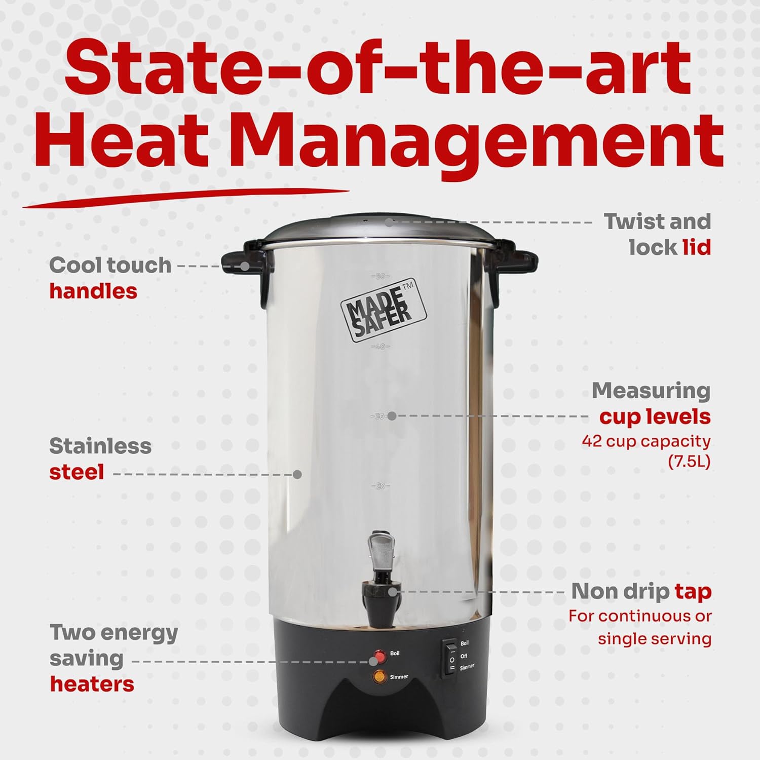 Our Made Safer 7.5L Hot Water Urn is a reliable and energy-efficient boiling dispenser designed for both home and commercial use. Perfect for tea, coffee, and hot drinks, it offers a generous 40-cup capacity, making it ideal for offices, catering, or family gatherings. Crafted with a durable stainless steel body and low energy consumption, this hot water urn ensures efficient performance while keeping your beverages piping hot for hours. Its automatic temperature control and secure locking lid provide convenience and safety, while the UK design guarantees quality, reliability, and long-lasting use.