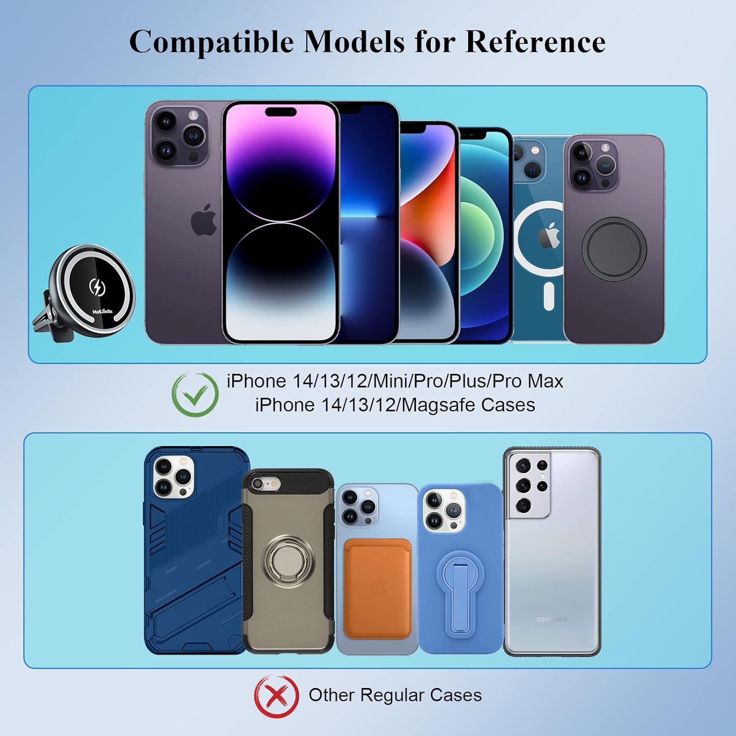 Our MagJIEYX MagSafe Car Mount Wireless Charger offers a seamless, powerful, and adjustable charging experience designed for iPhone 12 to 16 series with MagSafe magnetic cases. Built with a 20cm gooseneck arm and robust aluminum body, it ensures stability and flexibility on any road. With strong suction power, 15W–18W fast charging capability, and 14*N52 magnets for a secure grip, this wireless car charger mount delivers reliable performance even on rough terrains. Ideal for dashboard, windshield, vent, or desk installation, it keeps your phone fully charged and accessible wherever you go.