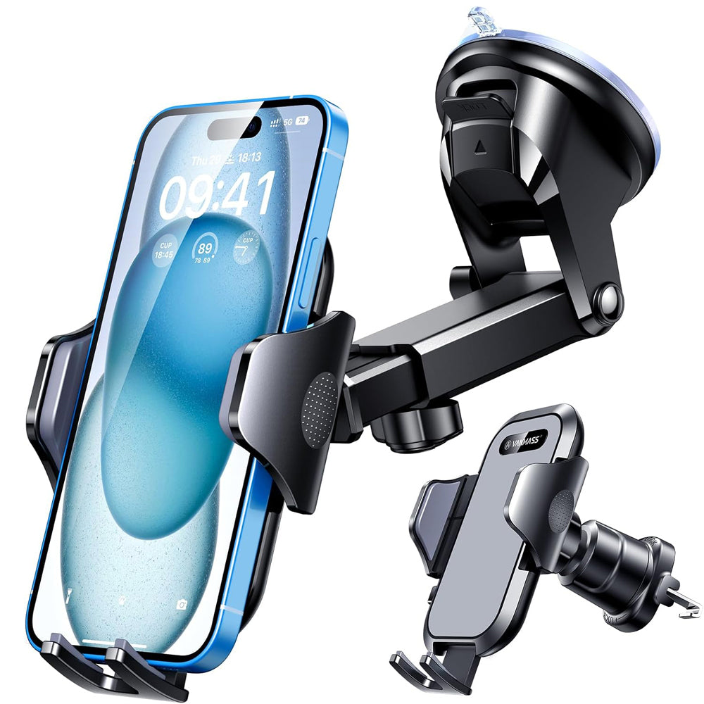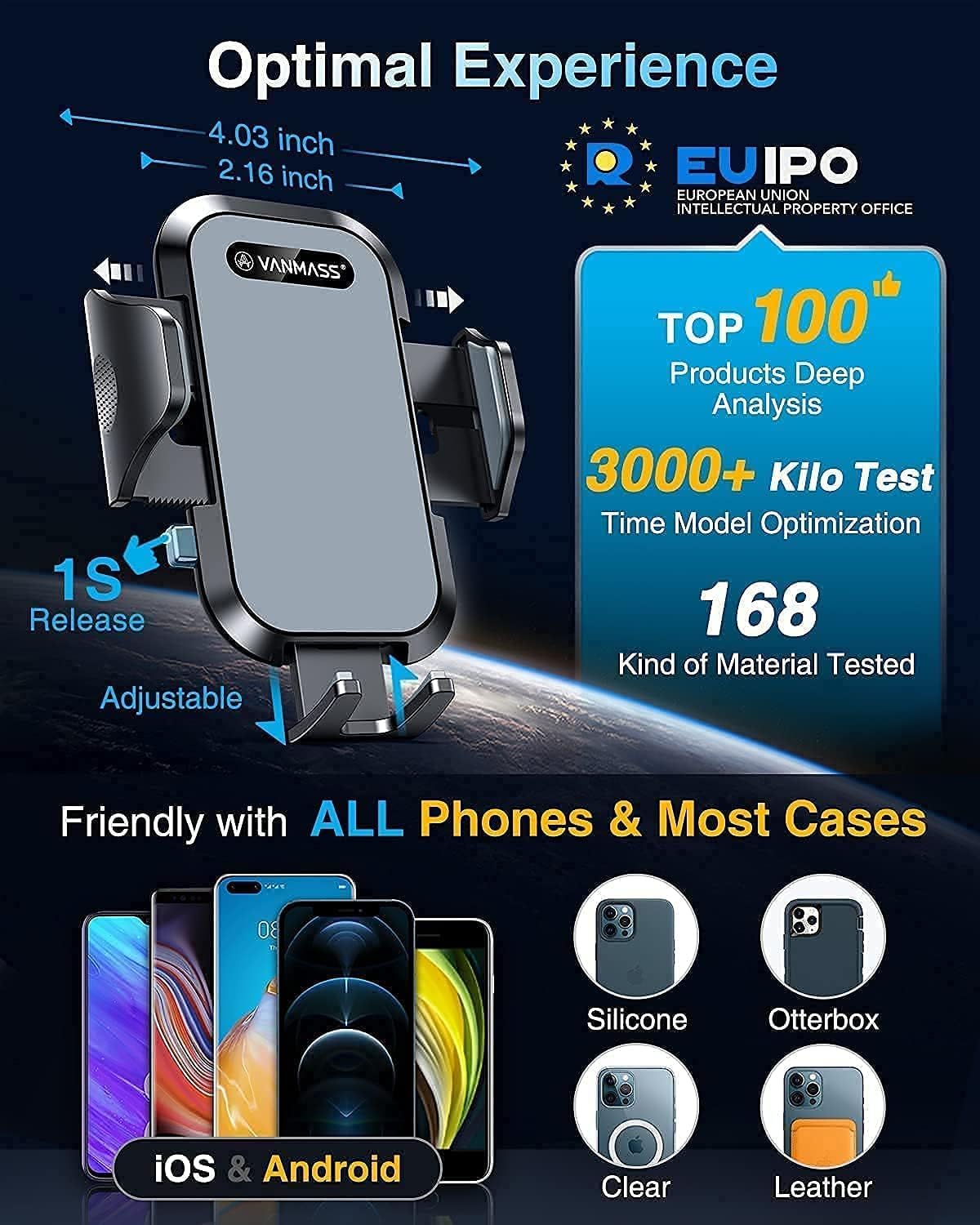 Elevate your driving experience with the VANMASS Military Grade Car Phone Holder Mount. Designed for ultimate safety and versatility, this suction universal mobile phone accessory offers unmatched stability and protection for your device. The 2024 upgraded version features a patented 8-gear adjustable foot design, silicon-wrapped support, and fingerprint clamps to securely hold phones of all sizes—even with cases on.