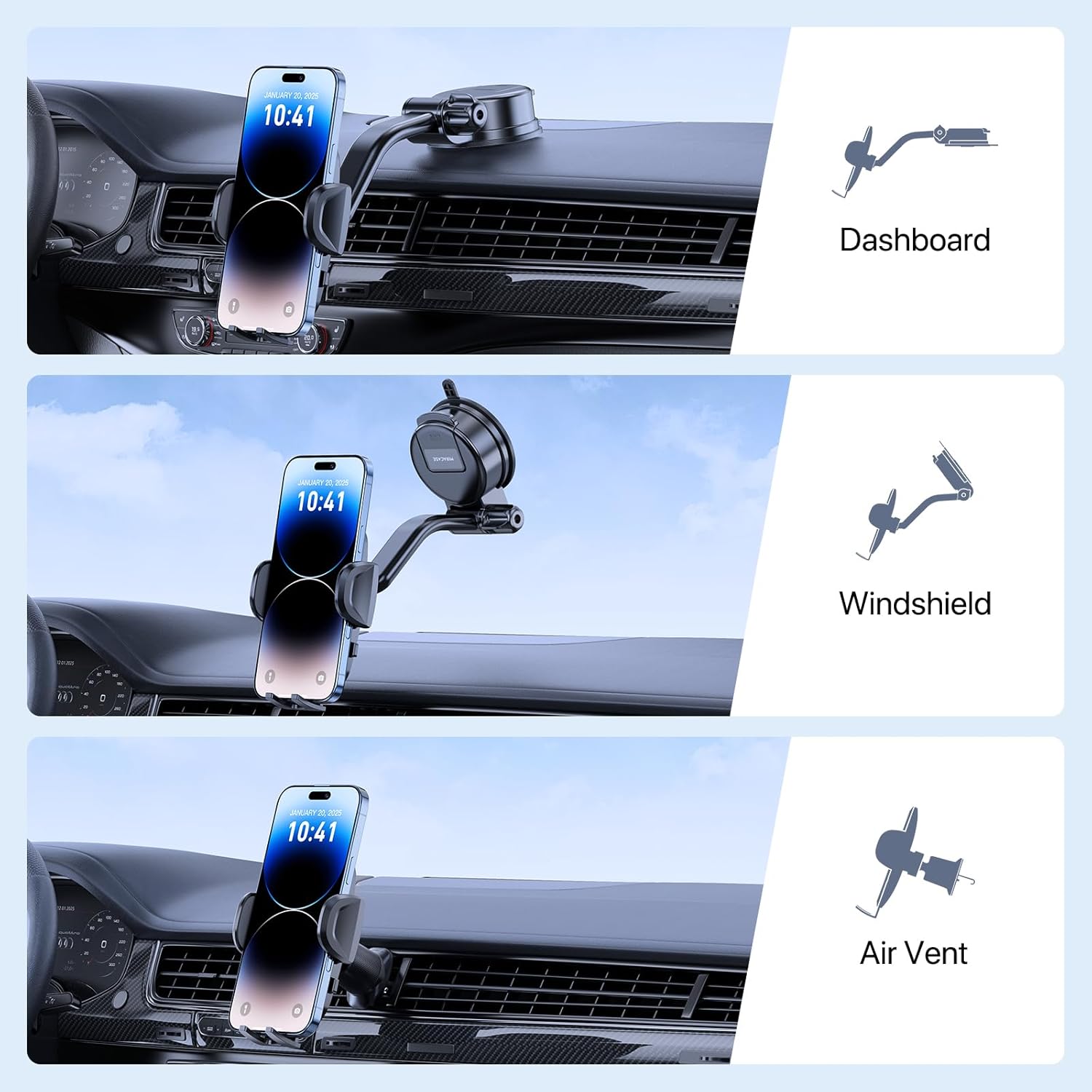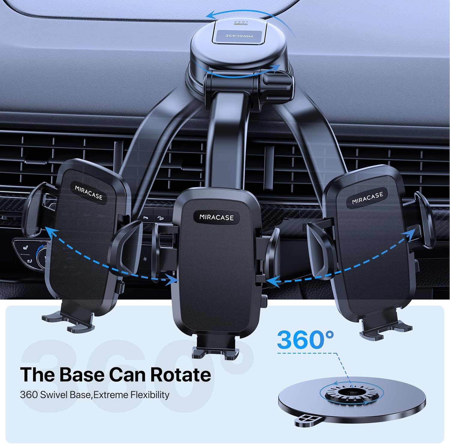 Our Miracase 3-in-1 Car Phone Holder delivers superior stability, powerful suction, and flexible positioning for an enhanced driving experience. Built with a military-grade suction cup and dual steel-hook design, it ensures a firm grip on dashboards, windshields, and air vents without leaving residue. Designed to fit all 4.0–7.0-inch smartphones, it provides 360° rotation for easy viewing and anti-slip silicone protection to keep your phone secure even on rough terrain. Perfect for cars, vans, SUVs, and taxis, this multifunctional mount is your reliable assistant for safe and convenient hands-free navigation.