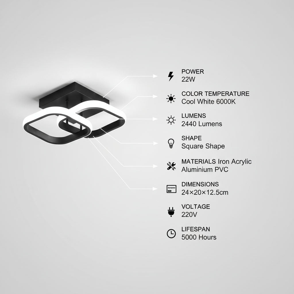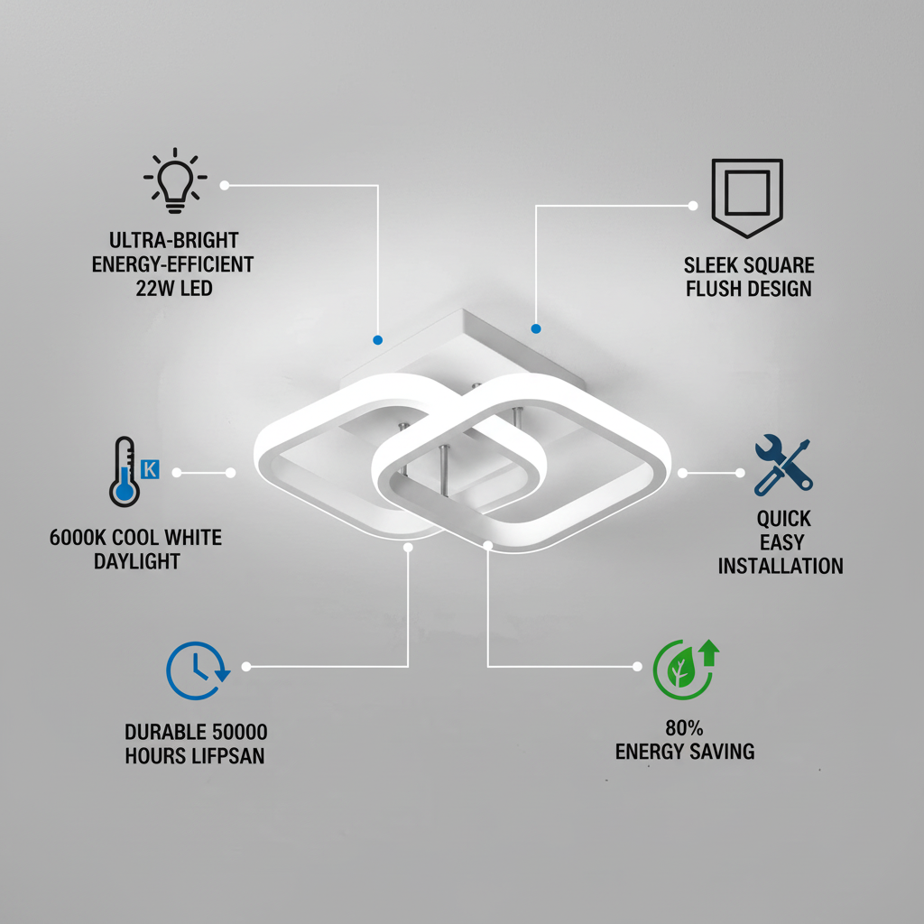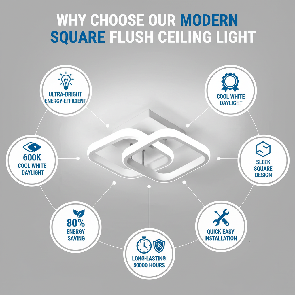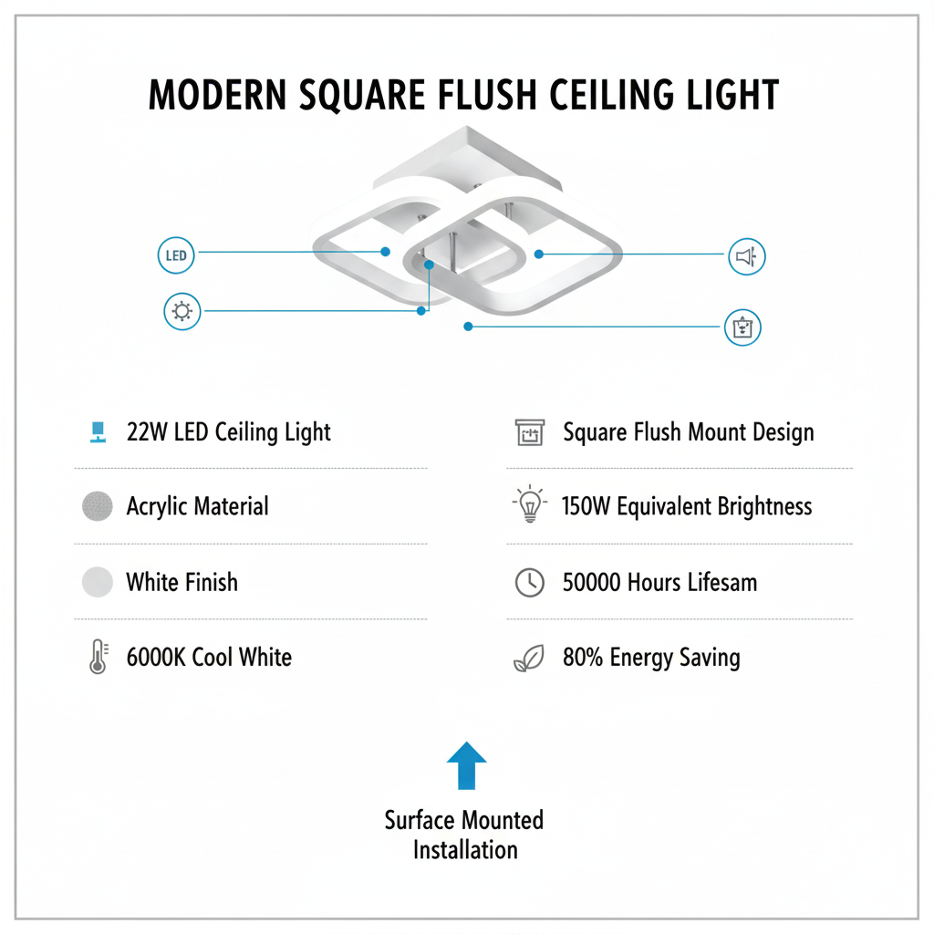 Square Flush Mount Design: Slim, low-profile build sits neatly against the ceiling, perfect for rooms with limited height