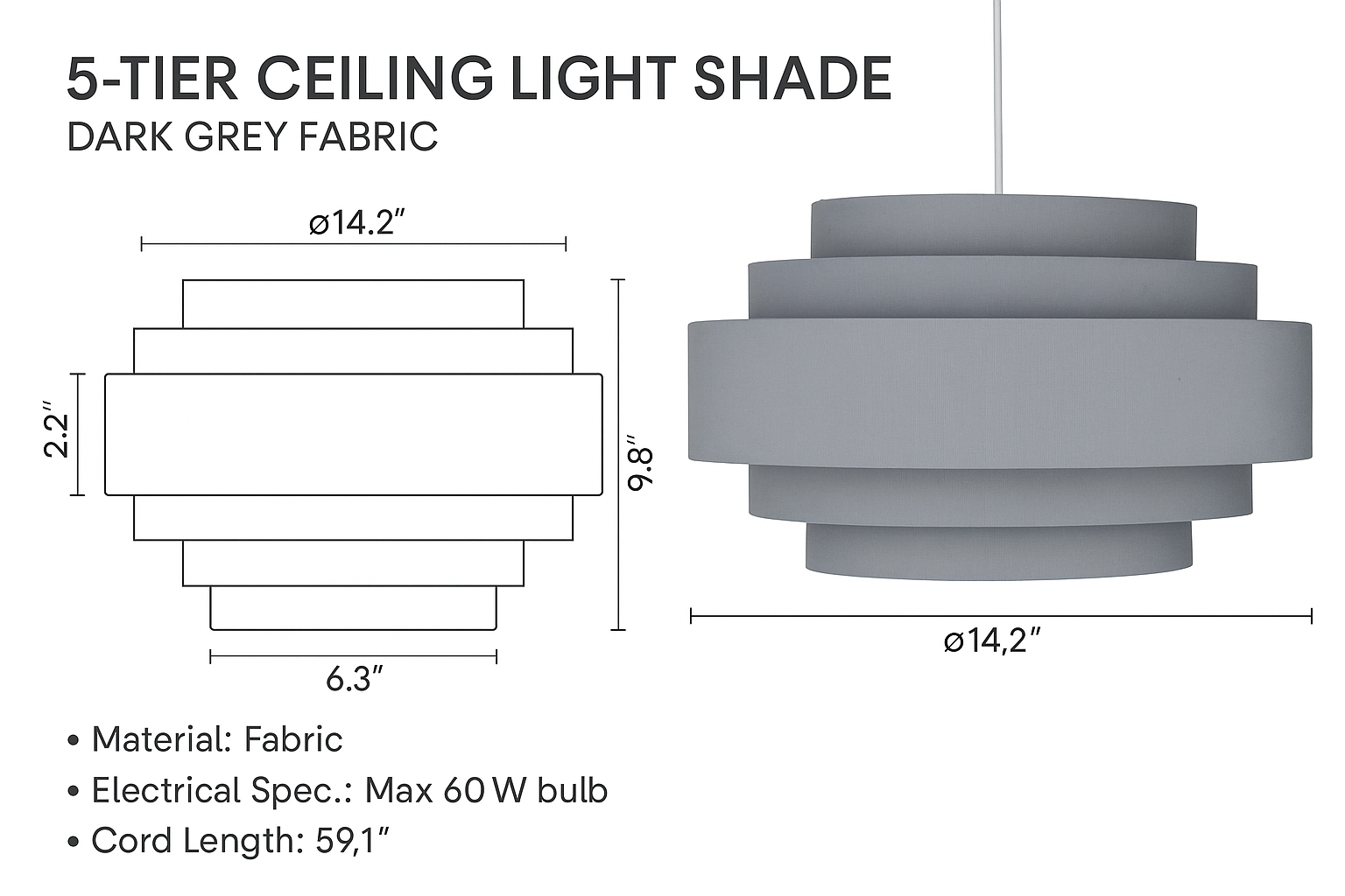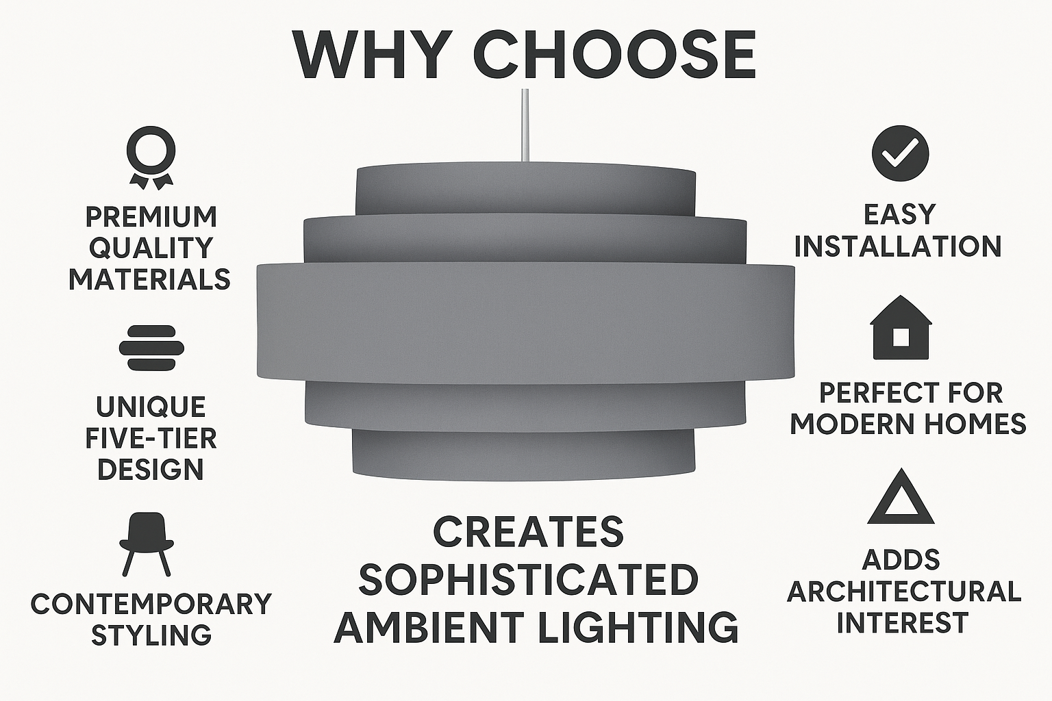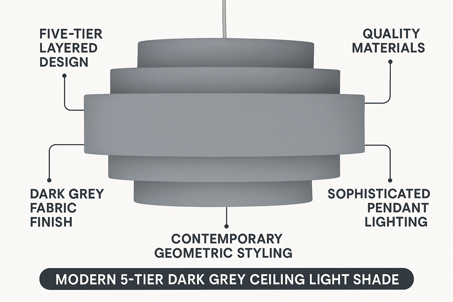 Our Modern 5-Tier Dark Grey Ceiling Light Shade is a stylish, easy-fit solution for enhancing any interior with layered elegance. The tiered design diffuses light beautifully while creating a bold, modern silhouette. Ideal for bedrooms, lounges, hallways, and dining areas, this pendant light shade supports 10W LED bulbs and requires no electrician for setup. A sleek upgrade for contemporary homes.