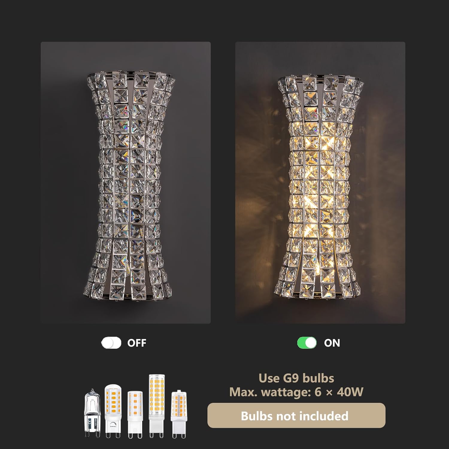 Our modern chrome crystal wall sconce is designed to deliver luxurious ambient lighting while enhancing interior décor with sculptural elegance. Featuring an artistic H-curve silhouette, polished chrome metal construction, and sparkling K9 crystal elements, this hardwired wall light creates dazzling light reflections ideal for bedrooms, living rooms, bathrooms, stairways, and hallways. Designed for use with six G9 bulbs, it offers decorative brilliance and refined illumination for contemporary indoor spaces.