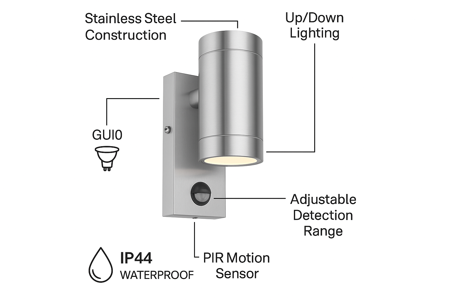 Enhance your outdoor spaces with the Modern Stainless Steel Up Down GU10 Motion Sensor Wall Light. This sleek and contemporary fixture is designed to provide both style and functionality, making it ideal for porches, entrances, pathways, and gardens. Equipped with a built-in PIR motion sensor and an IP44 rating, it ensures reliable performance in various weather conditions while offering added security.