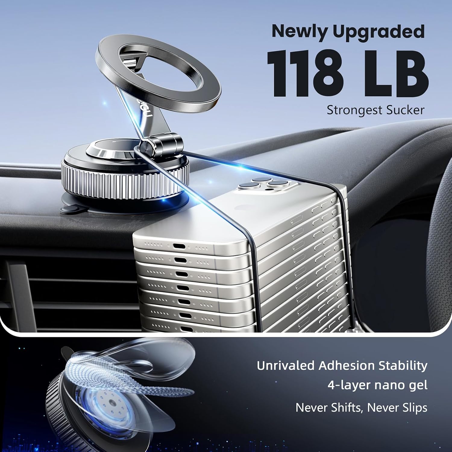 Experience unmatched stability and premium build quality with the MOGU Magnetic Car Phone Holder, engineered for secure hands-free driving. Featuring a powerful vacuum suction cup combined with 25 N55 neodymium magnets, this MagSafe-compatible car mount ensures your smartphone stays in place — even on rough terrain or during sharp turns.