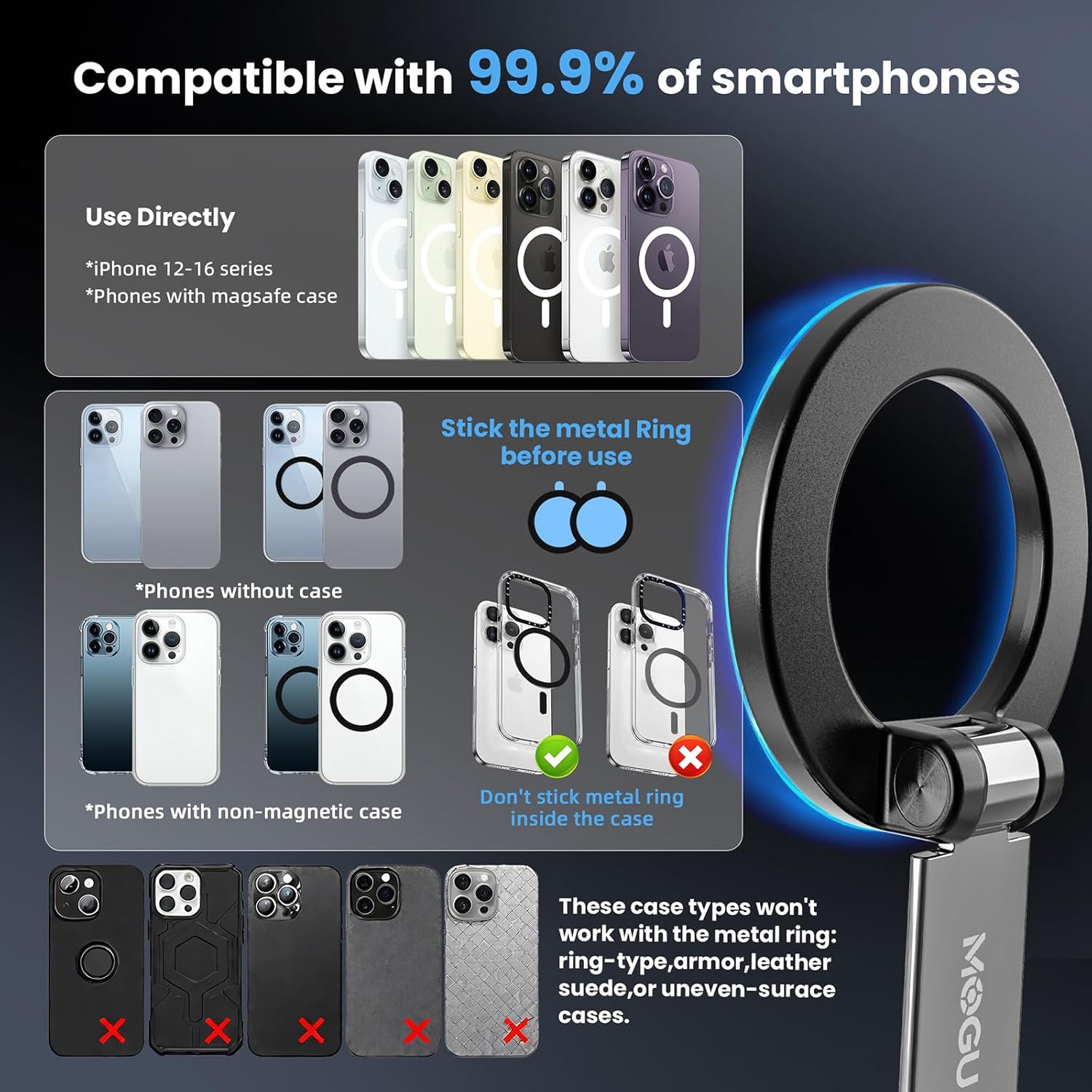 Compatible with iPhone 17–12 series and other smartphones via metal ring adapter