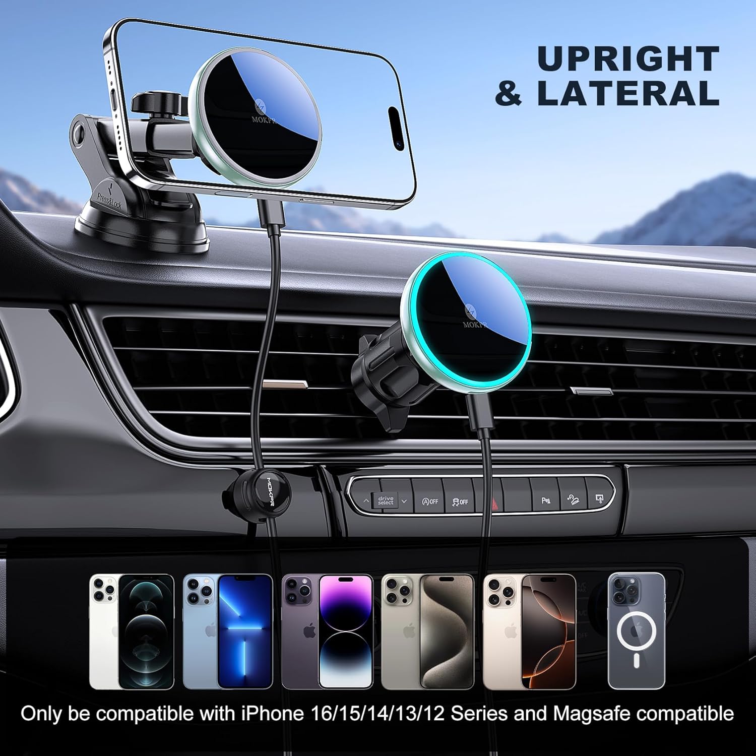 Crafted with a non-slip silicone pad and scratch-resistant acrylic finish, the MOKPR car mount protects your phone while maintaining a stylish, modern look. The integrated LED backlight creates a pleasant driving atmosphere—perfect for night drives or relaxing commutes. Compatible with all MagSafe-enabled iPhones and cases, this car mount is your perfect travel companion for safe, efficient, and stylish charging on the go.