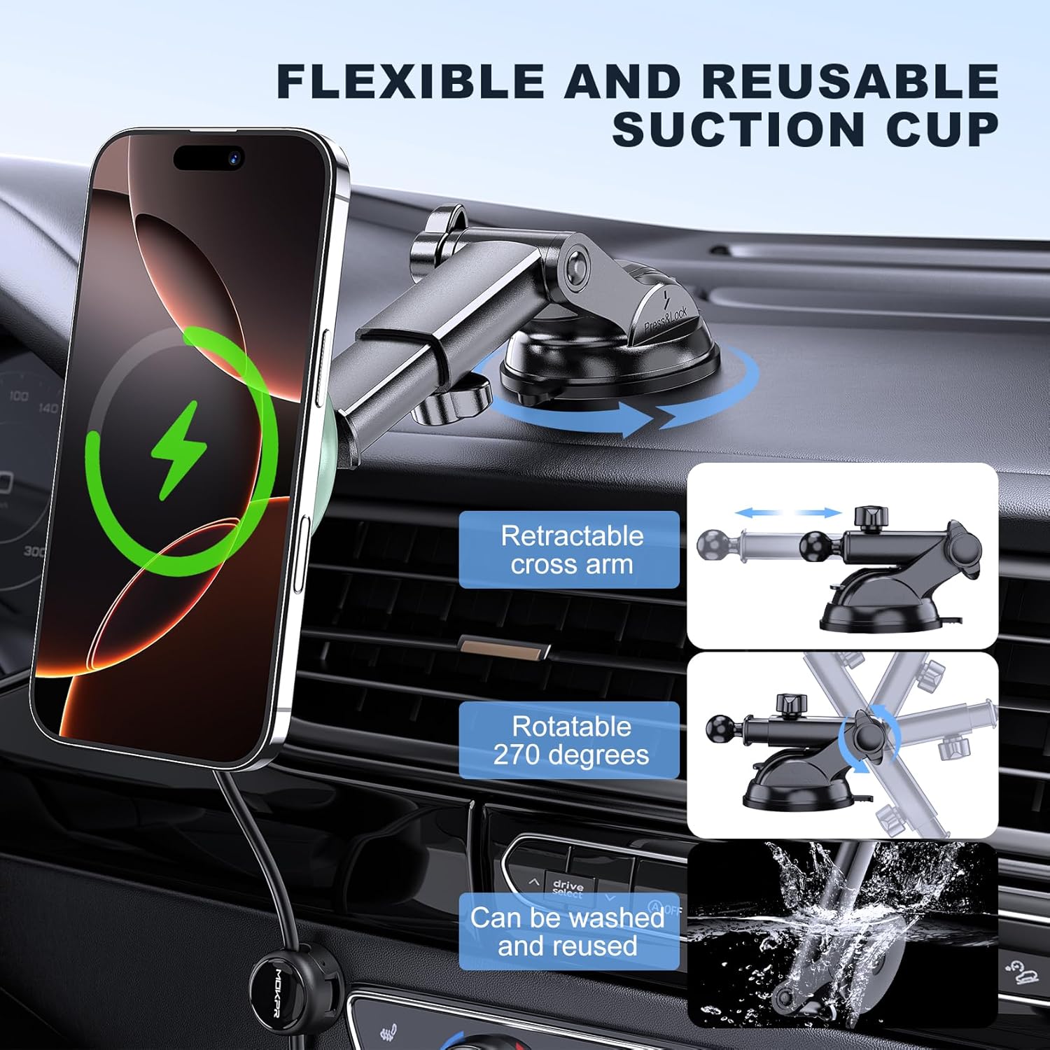 Built from durable, heat-resistant materials, the MOKPR MagSafe Car Charger is engineered for long-term performance and smooth operation. Its 360° ball joint and telescopic arm offer flexible adjustment, making it easy to switch between portrait and landscape modes with one hand. With a powerful magnetic hold of up to 2000g, your phone stays stable even on rough roads.