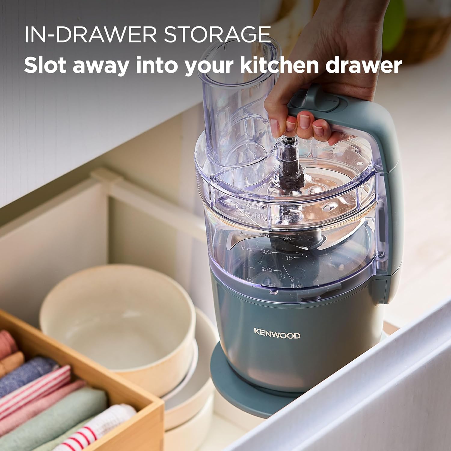 Equipped with a durable knife blade and a 4mm slicing/grating disk, it ensures precision and consistency in every use. Its compact design is perfect for modern kitchens, making it easy to store and clean. Ideal for busy home cooks who want powerful performance without the bulk.