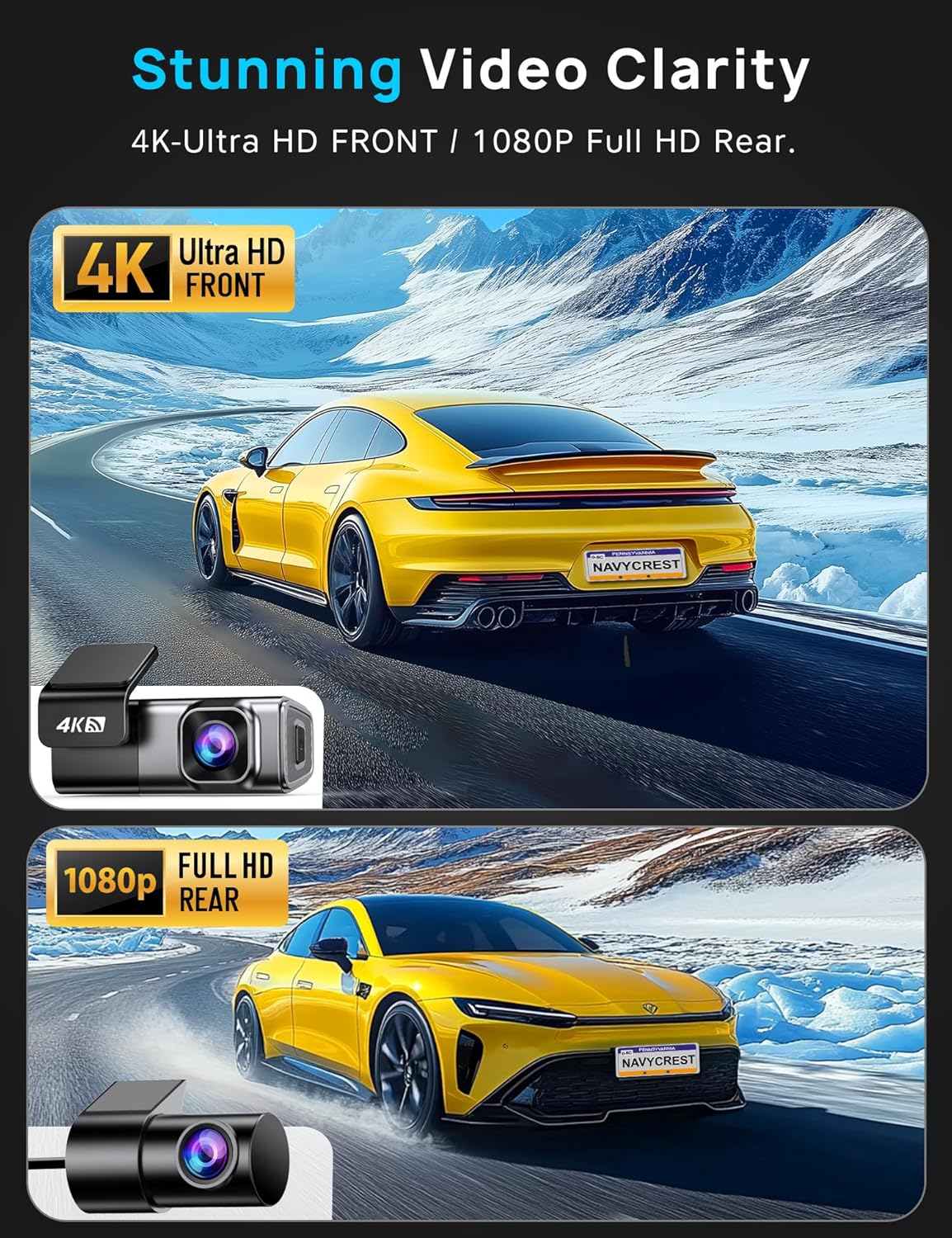 Front 4K and rear 1080P dual-channel recording for ultimate road coverage