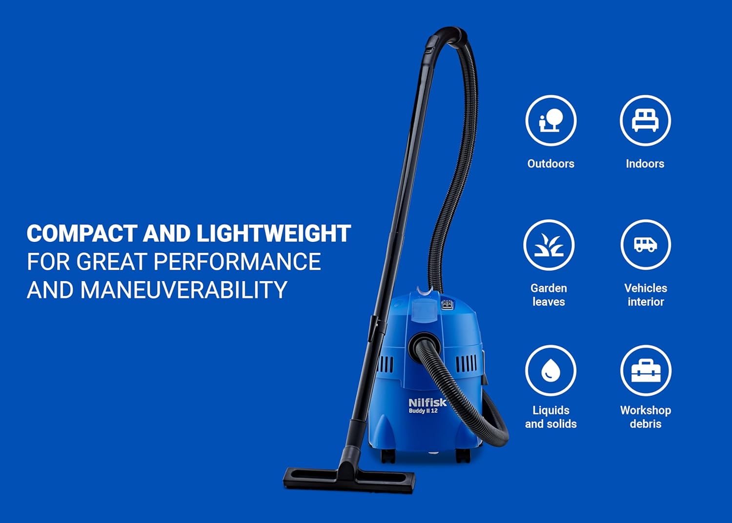 Our Nilfisk Buddy II 12L Wet and Dry Vacuum Cleaner delivers powerful 1200W suction performance for efficient indoor and outdoor cleaning. Designed for versatility, it easily handles wet and dry debris in your home, car, workshop, or garden. With a compact and ergonomic design, this lightweight canister vacuum ensures easy mobility while offering both suction and blowing functionality—ideal for clearing leaves, dust, dirt, and even water spills. The 12L tank capacity allows extended cleaning sessions without frequent emptying, making it a reliable choice for everyday and heavy-duty cleaning tasks.