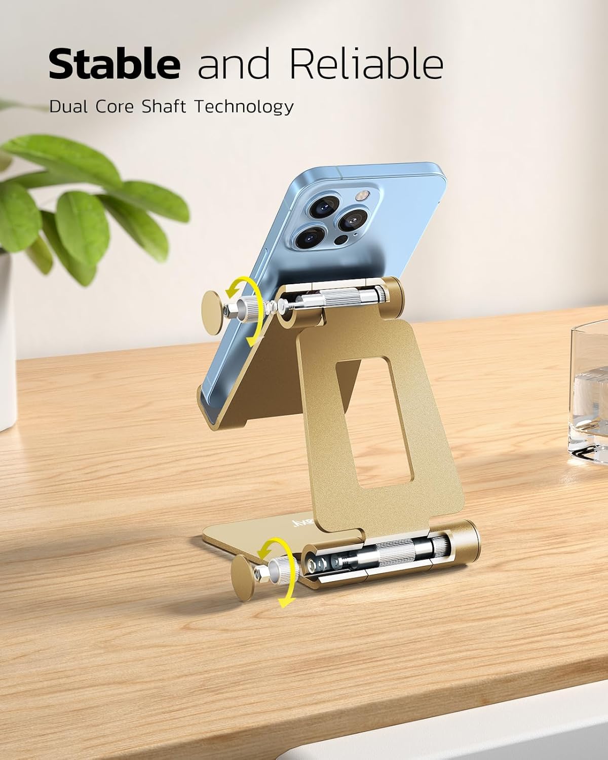Our Nulaxy Foldable Adjustable Phone Stand in gold is a versatile and portable mobile holder designed for effortless viewing and use of smartphones, tablets, and e-readers. Crafted from premium aluminum, this sturdy stand provides stable support without wobbling, while rubber pads prevent scratching and slipping. Fully collapsible and adjustable, it allows for optimal angles for video watching, gaming, video calls, recipe viewing, and FaceTime, accommodating devices from 4" to 8". The stand is case-friendly with an 18mm hook width, ensuring compatibility even with heavy phone cases.