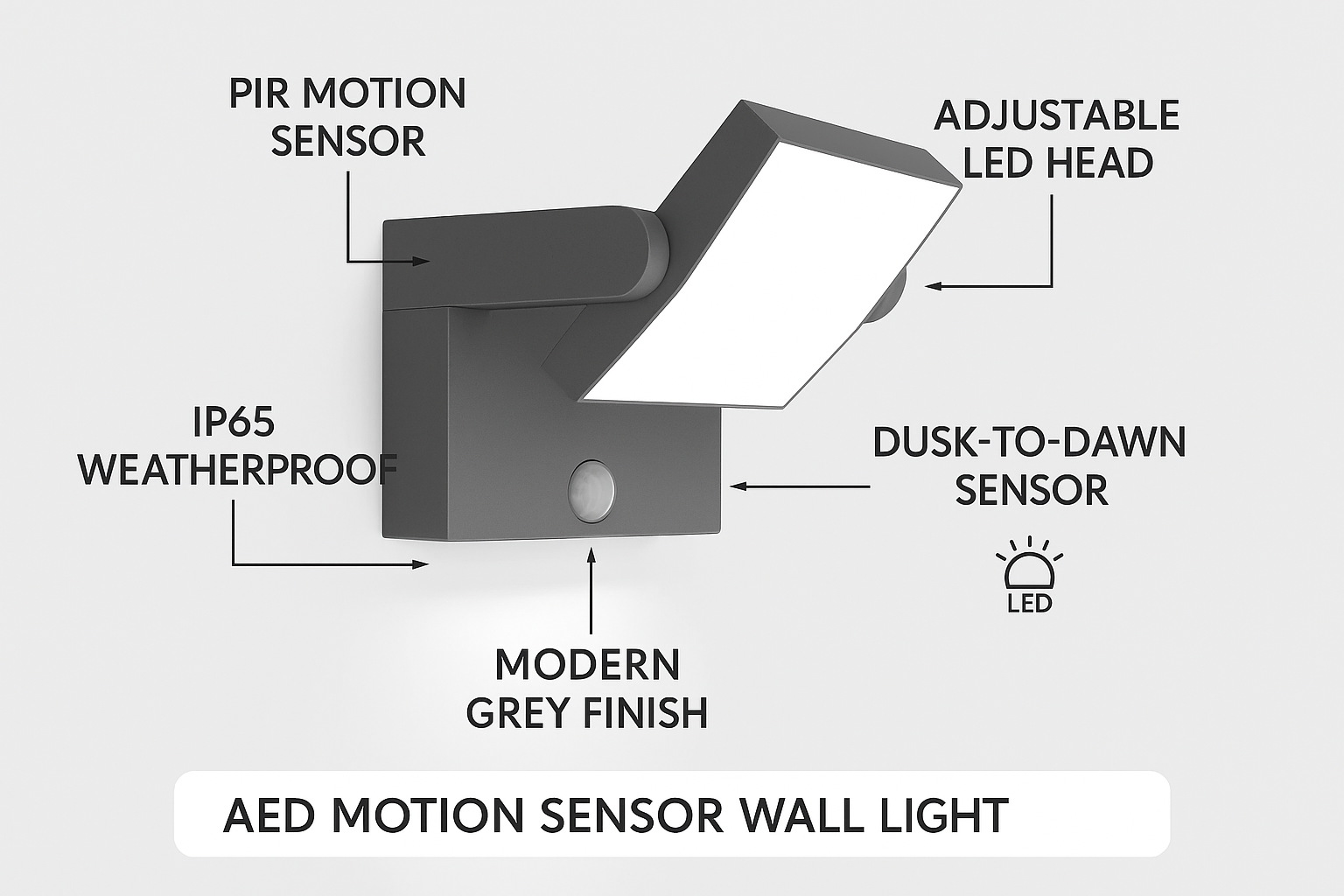 The motion sensor detects movement up to 8 meters, automatically turning on the light when motion is detected, enhancing outdoor security.