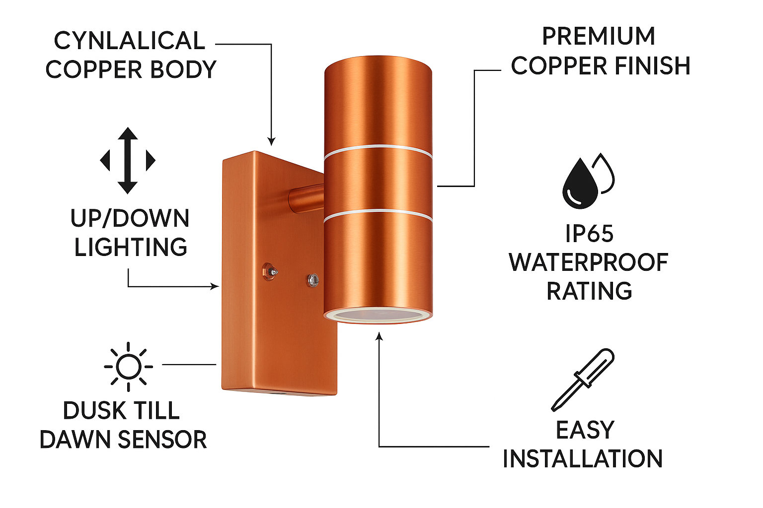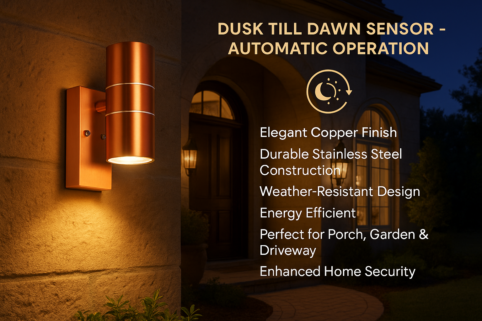 Our Outdoor Wall Light with Dusk Till Dawn Sensor combines elegance and practicality, providing continuous illumination throughout the night. Crafted with a stylish copper finish and durable stainless steel construction, this light is built to withstand the elements, offering reliable outdoor lighting year-round. Featuring a Dusk Till Dawn sensor, it automatically turns on at sunset and off at sunrise, providing hands-free operation and energy efficiency. Perfect for illuminating your porch, garden, or driveway, this wall light creates a warm, welcoming atmosphere while enhancing your home's security.