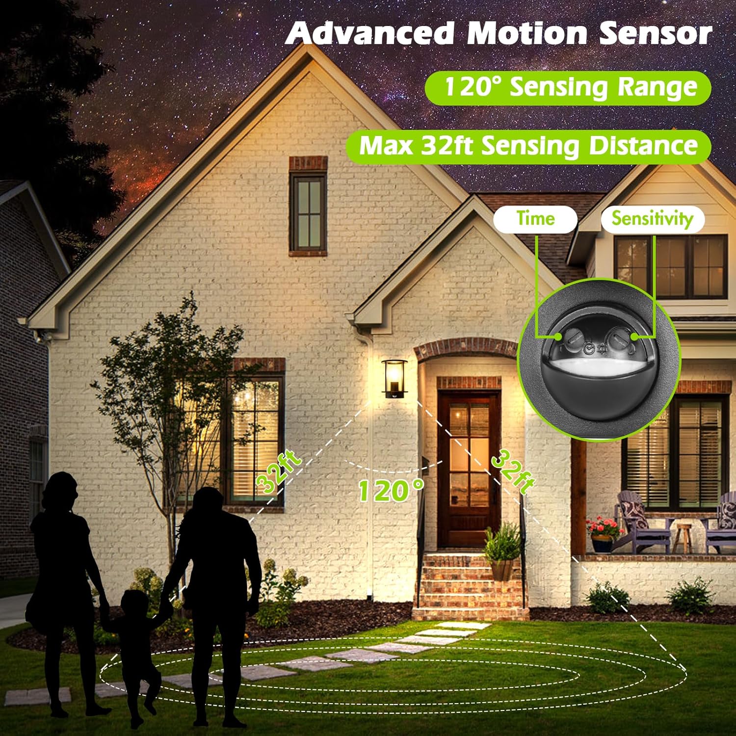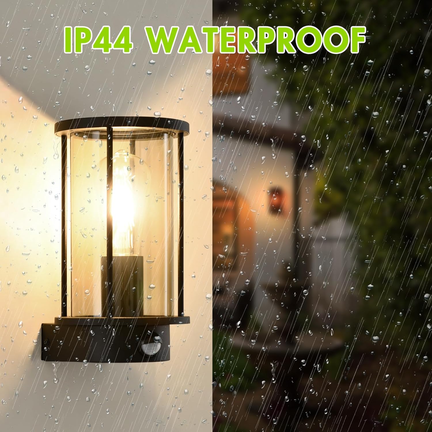 Outdoor Wall Lights with Motion Sensor, Waterproof Anti-Rust Aluminium Wall Lantern Sconce, Black Mains Powered E27 Base Glass Outside Light for Patio Garage Porch (Bulb Not Included)
