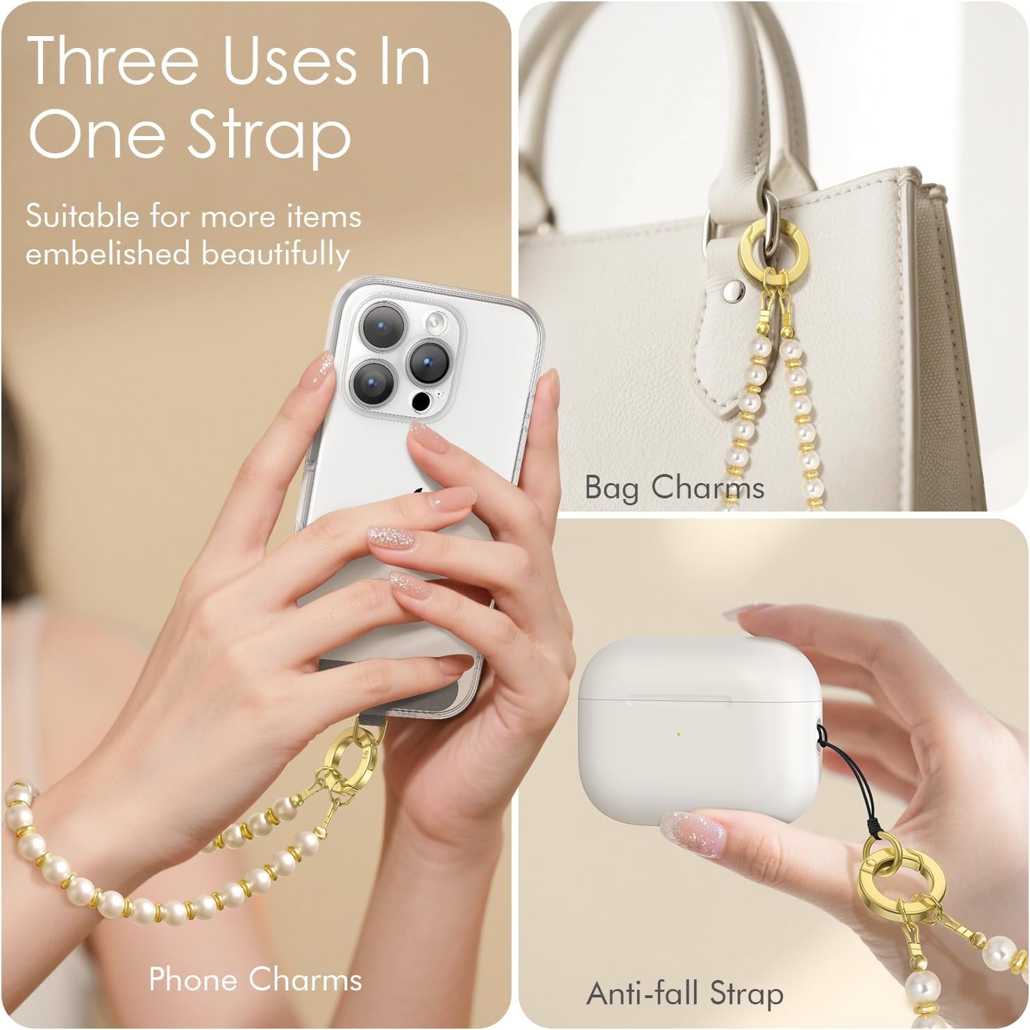 Our pearl gold phone charm offers a stylish and practical way to keep your device secure, featuring high-quality imitation pearls, gold flat beads, and a durable metal buckle designed for long-lasting elegance. This anti-lost wrist lanyard attaches easily using the ring strap or included tether tab, ensuring versatile compatibility with phone cases, bags, keys, headphones, and more. Built with steel-wire internal structure for strength, polished pearls for long-term shine, and nickel-free, skin-friendly components, it delivers beauty and reliability without compromising charging convenience.