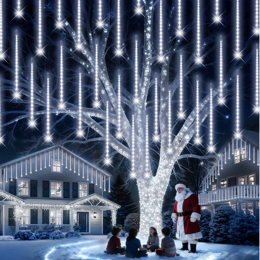 ransform your home or garden into a winter wonderland with the PEMOTech 16-Tube Meteor Shower Lights. Featuring 576 high-quality SMD2835 LEDs across 16 transparent PVC tubes, these icicle lights deliver a stunning ice rain effect and rolling meteor shower pattern. Perfect for outdoor Christmas decorations, Halloween, weddings, or any festive occasion, these cool white lights provide 360-degree illumination for a dazzling display. Designed with IP65 waterproofing and UL-certified low-voltage safety, they withstand rain, snow, and extended outdoor use while remaining cool to the touch. Flexible design with a 5-meter leading wire allows easy setup, and connectable plugs enable expansion with multiple strings for larger displays. Bring magic and elegance to your holiday decorations with these high-quality, energy-efficient lights.